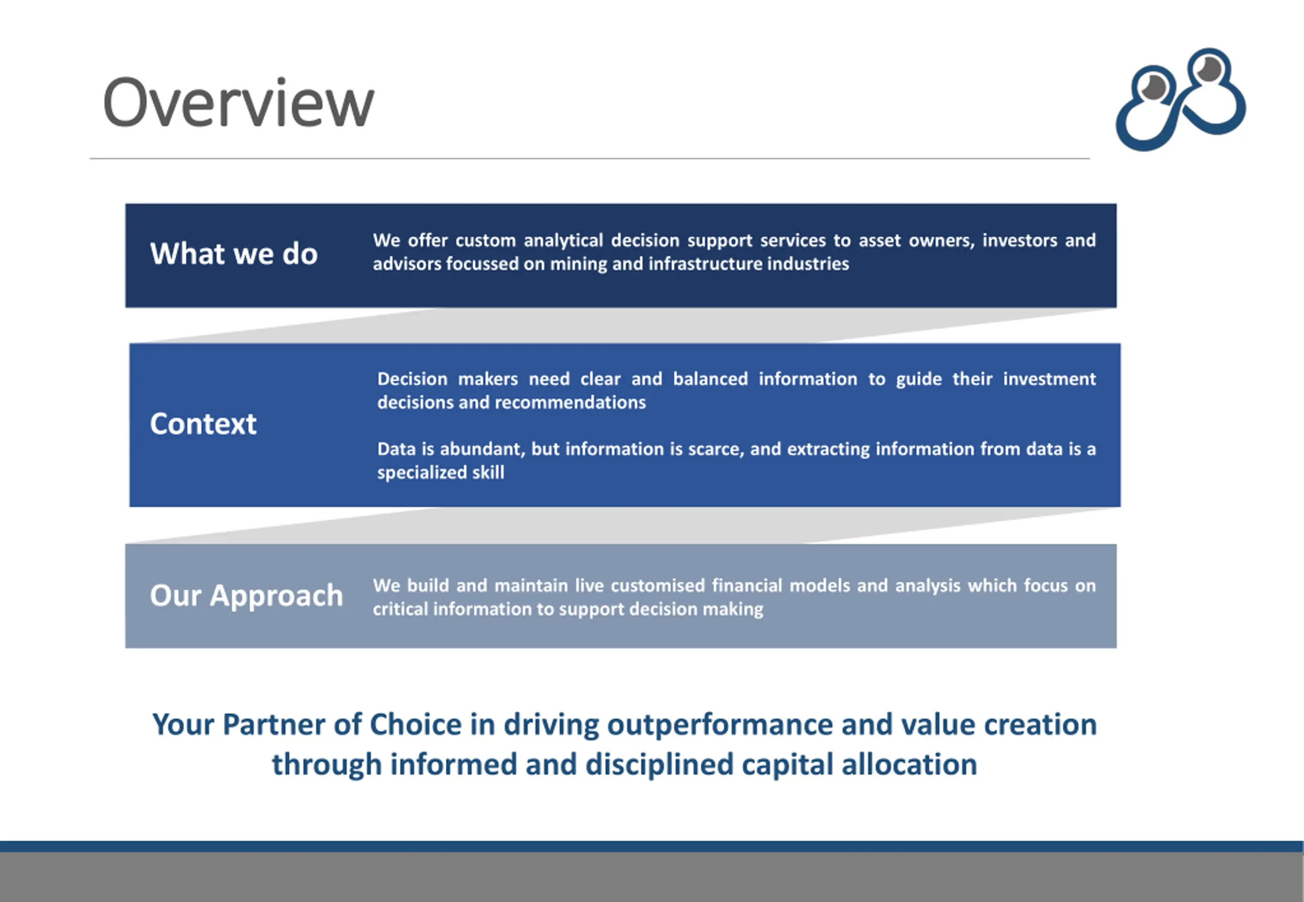 Overview Overview We offer custom analytical decision support services to asset owners, investors and advisors focussed on mining and infrastructure industries What we do Decision makers need clear and balanced information to guide their investment decisions and recommendations Context Data is abundant, but information is scarce, and extracting information from data is a specialized skill We build and maintain live customised financial models and analysis which focus on critical information to support decision making Our Approach Your Partner of Choice in driving outperformance and value creation through informed and disciplined capital allocation