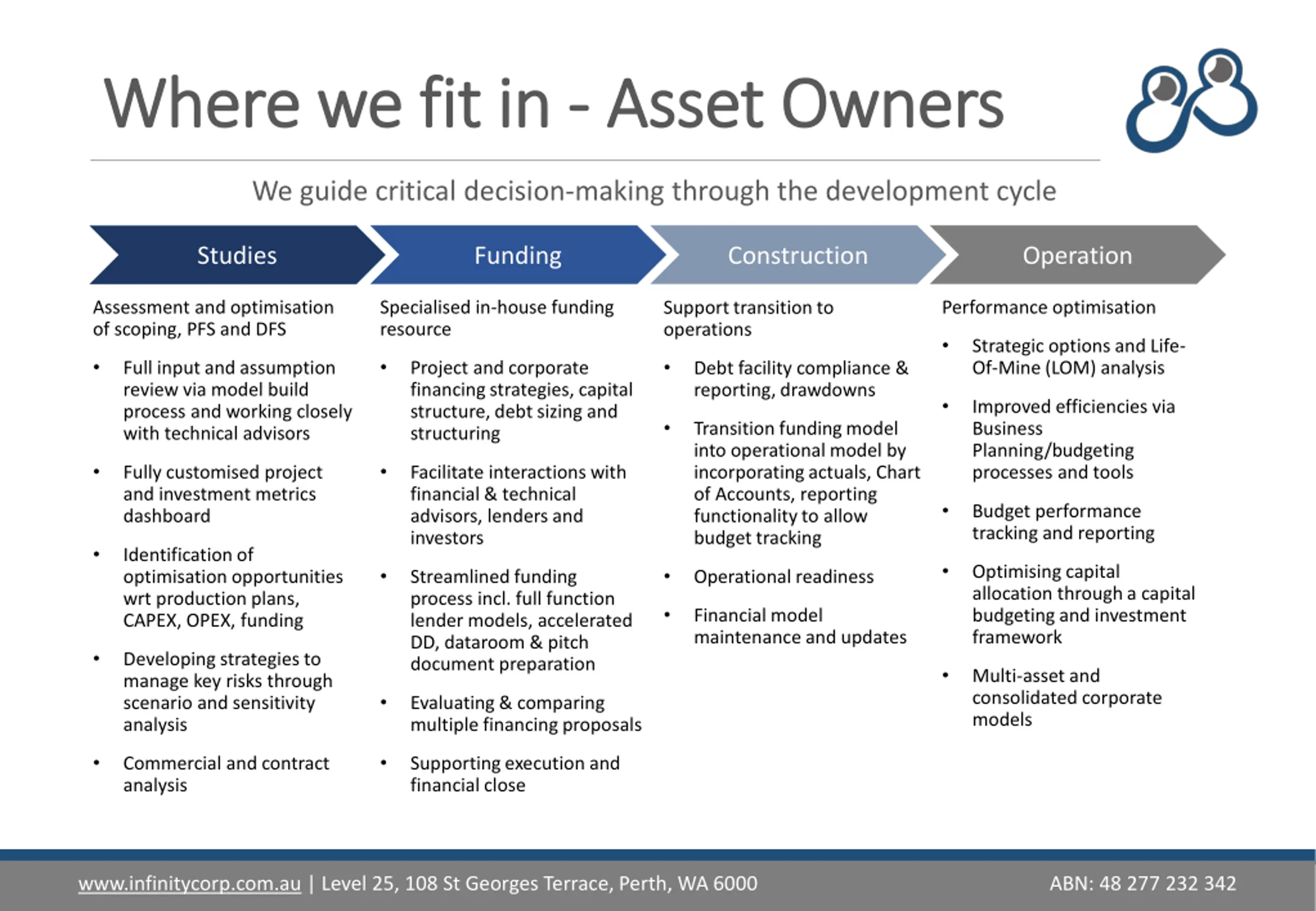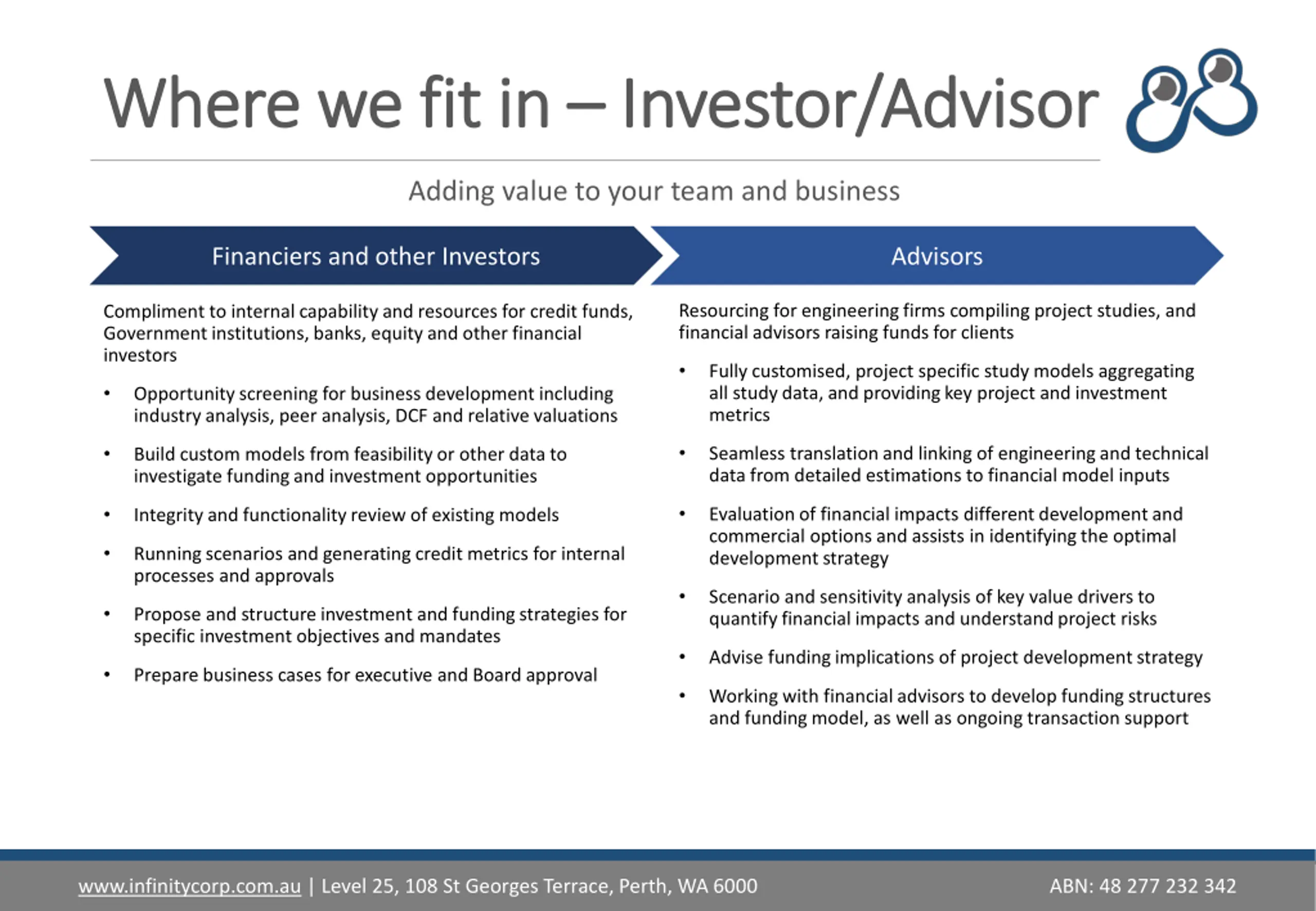Infinity Corporate Finance offers custom analytical decision support services to asset owners, investors, and advisors focused on mining and infrastructure industries. They provide specialized financial models and analysis to drive informed capital allocation decisions and value creation.