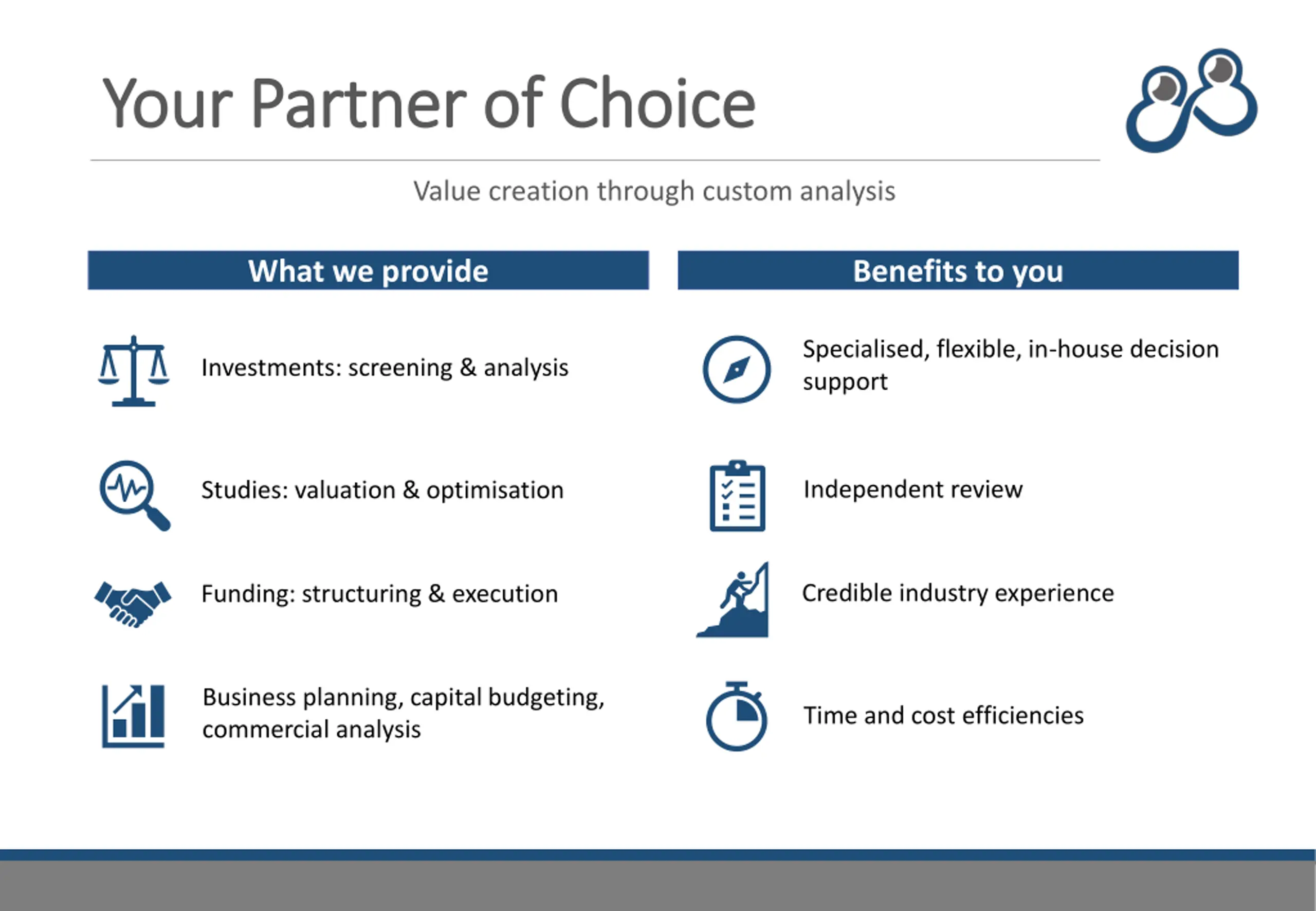 Your Partner of Choice Your Partner of Choice Value creation through custom analysis What we provide Benefits to you Specialised, flexible, in-house decision support Investments: screening & analysis Independent review Studies: valuation & optimisation Credible industry experience Funding: structuring & execution Business planning, capital budgeting, commercial analysis Time and cost efficiencies