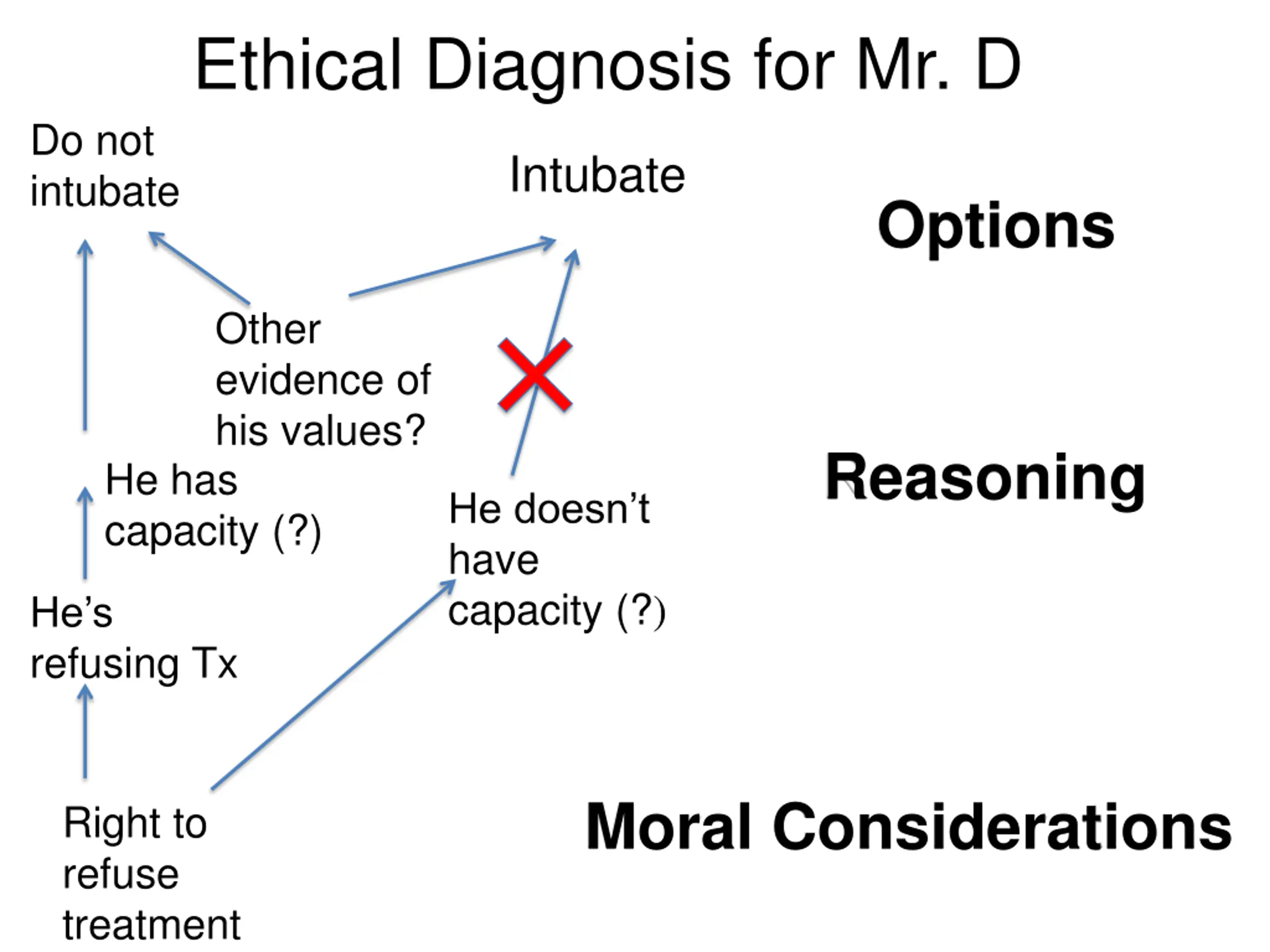 Ethical Diagnosis for Mr. D Do not intubate Options He has decisional capacity Reasoning He s refusing Tx Moral Right to refuse treatment Considerations