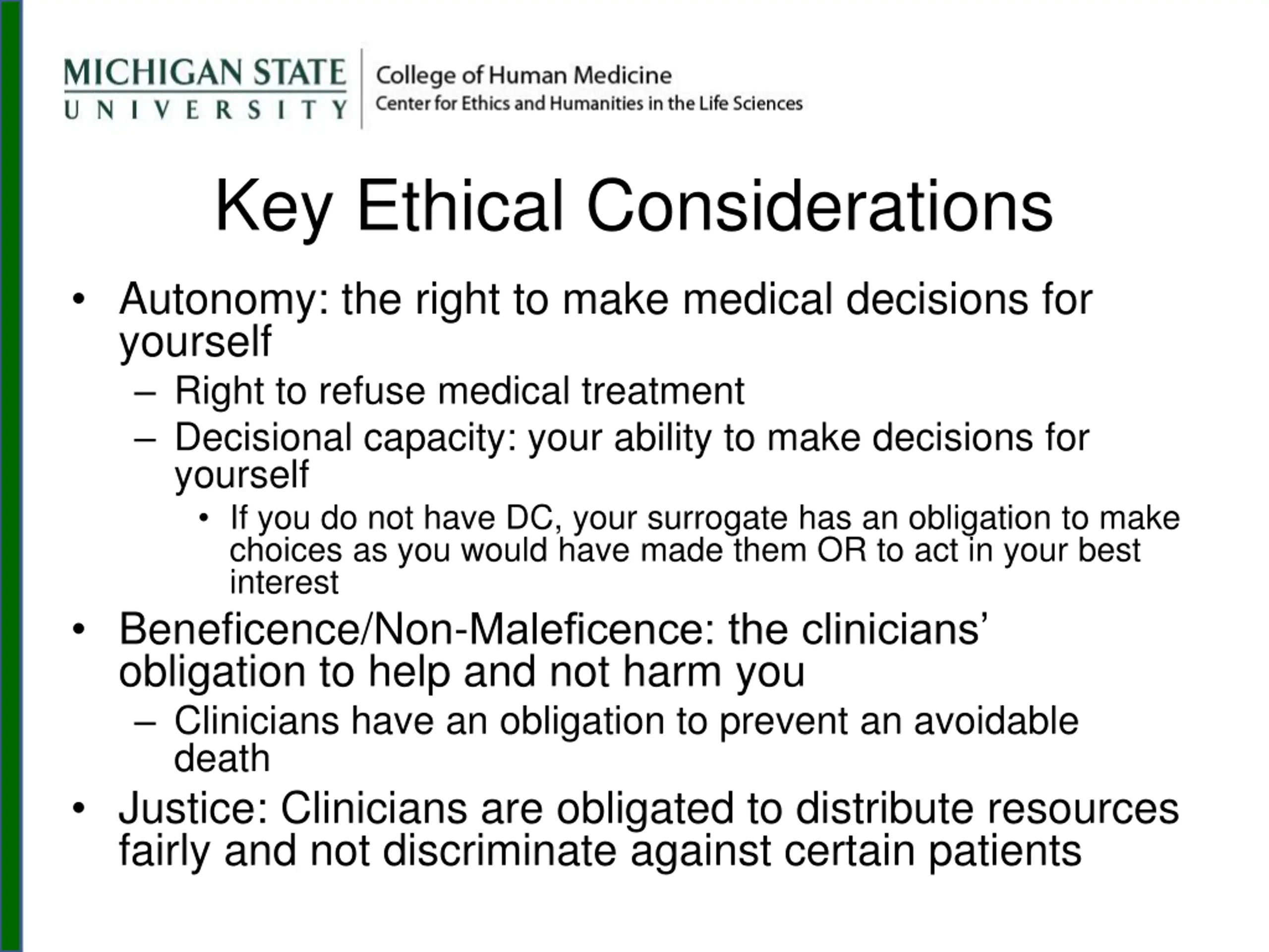 Key Ethical Considerations Autonomy: the right to make medical decisions for yourself Right to refuse medical treatment Decisional capacity: your ability to make decisions for yourself If you do not have DC, your surrogate has an obligation to make choices as you would have made them OR to act in your best interest Beneficence/Non-Maleficence: the clinicians obligation to help and not harm you Clinicians have an obligation to prevent an avoidable death Justice: Clinicians are obligated to distribute resources fairly and not discriminate against certain patients