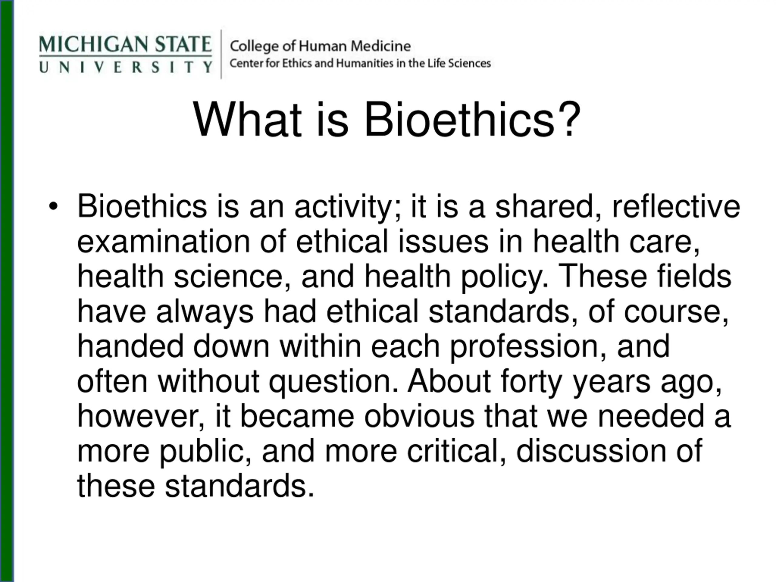 What is Bioethics? Bioethics is an activity; it is a shared, reflective examination of ethical issues in health care, health science, and health policy. These fields have always had ethical standards, of course, handed down within each profession, and often without question. About forty years ago, however, it became obvious that we needed a more public, and more critical, discussion of these standards.