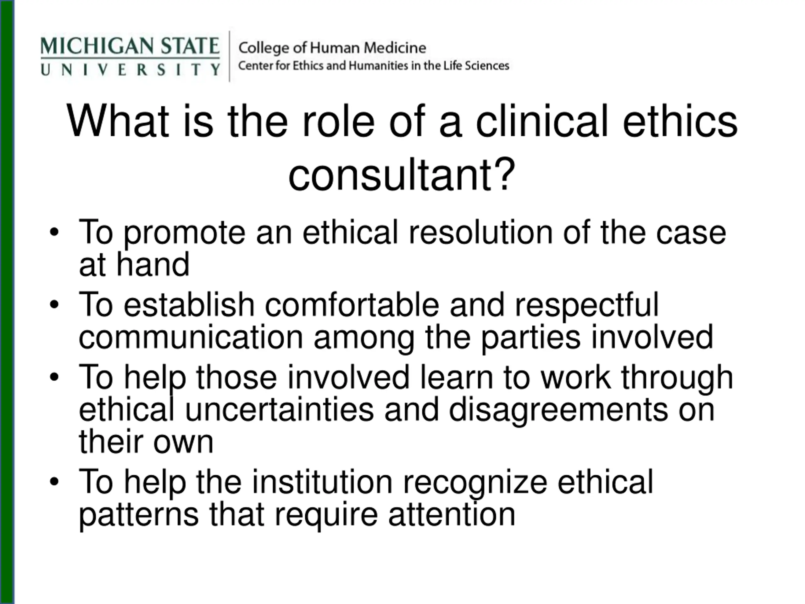 What is the role of a clinical ethics consultant? To promote an ethical resolution of the case at hand To establish comfortable and respectful communication among the parties involved To help those involved learn to work through ethical uncertainties and disagreements on their own To help the institution recognize ethical patterns that require attention