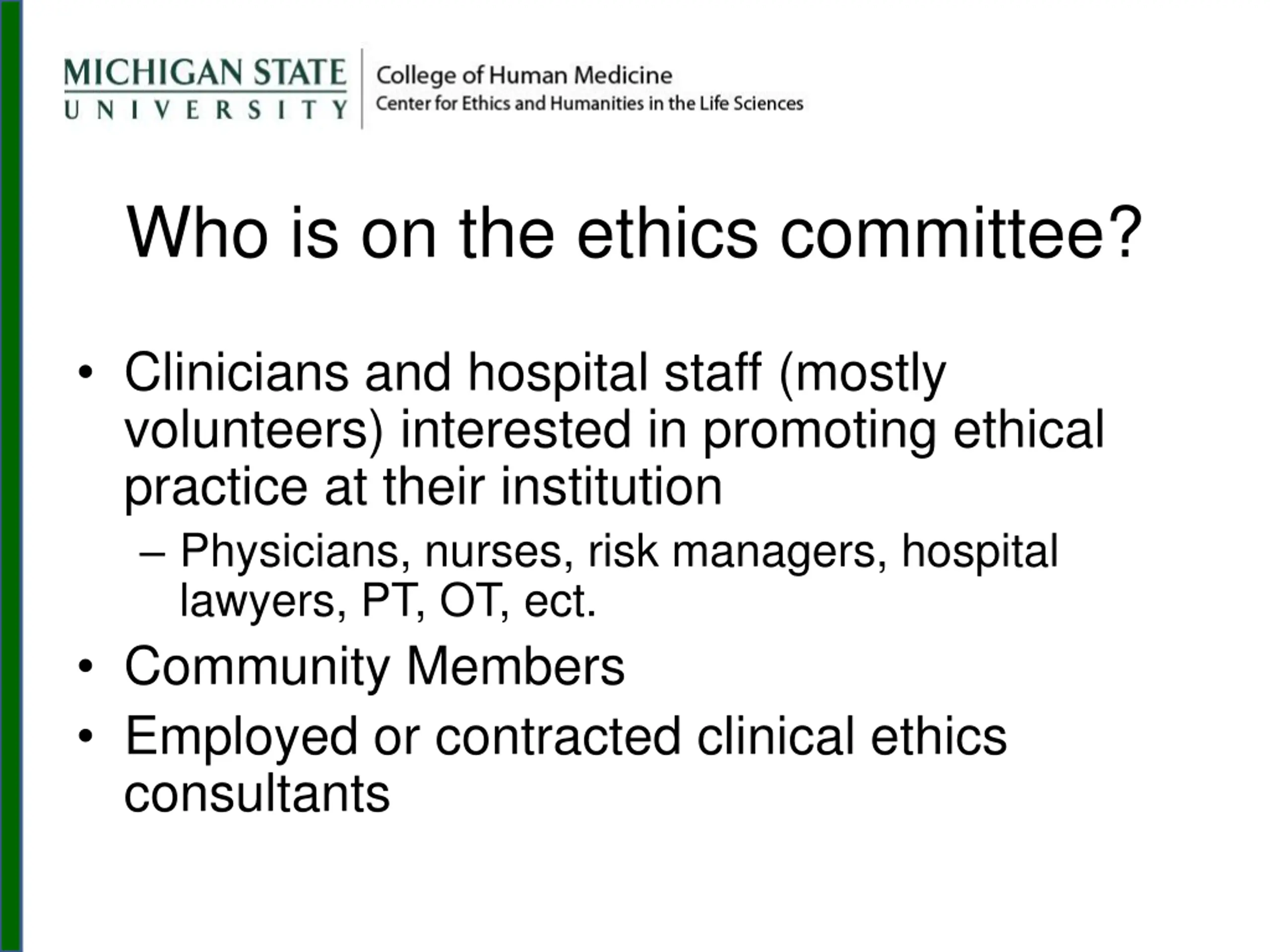 Who is on the ethics committee? Clinicians and hospital staff (mostly volunteers) interested in promoting ethical practice at their institution Physicians, nurses, risk managers, hospital lawyers, PT, OT, ect. Community Members Employed or contracted clinical ethics consultants