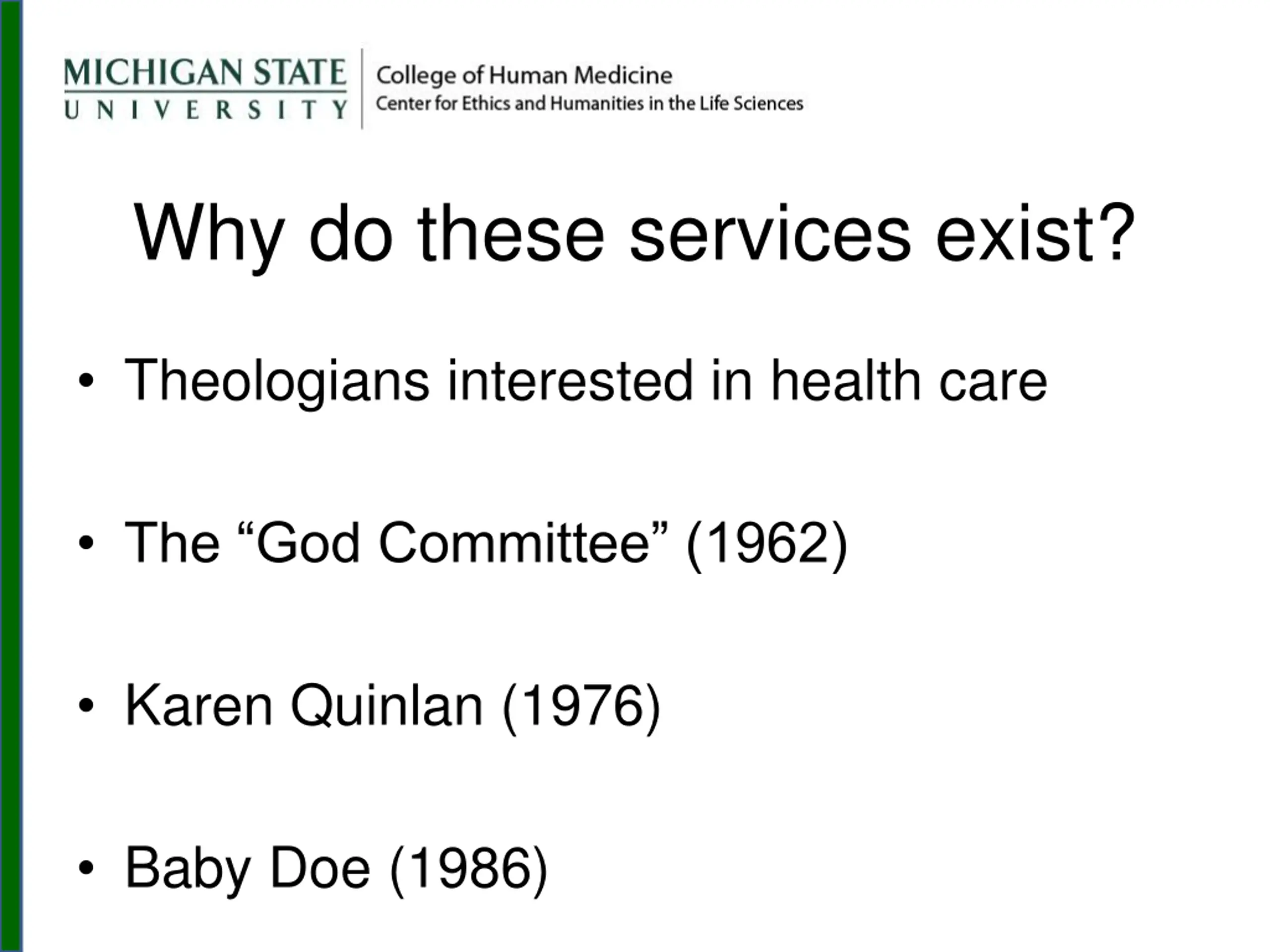 Why do these services exist? Theologians interested in health care The God Committee (1962) Karen Quinlan (1976) Baby Doe (1986)