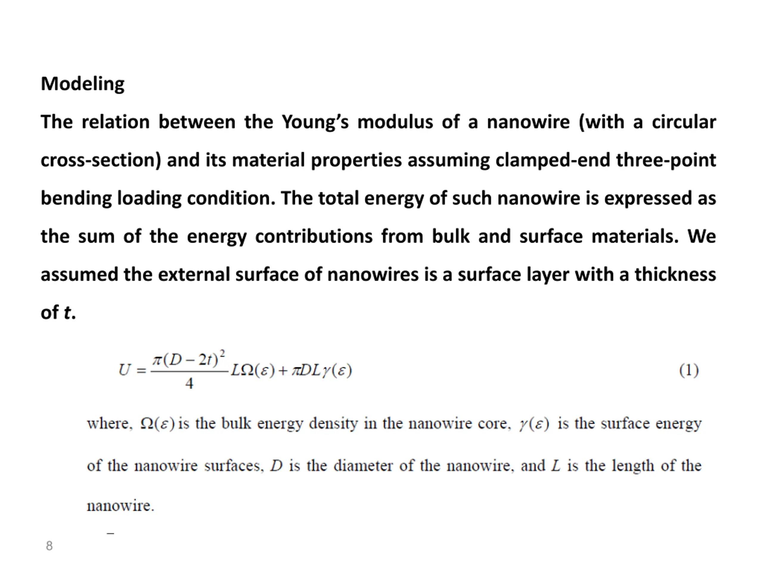Modeling The relation between the Young s modulus of a nanowire (with a circular cross-section) and its material properties assuming clamped-end three-point bending loading condition. The total energy of such nanowire is expressed as the sum of the energy contributions from bulk and surface materials. We assumed the external surface of nanowires is a surface layer with a thickness of t. 8