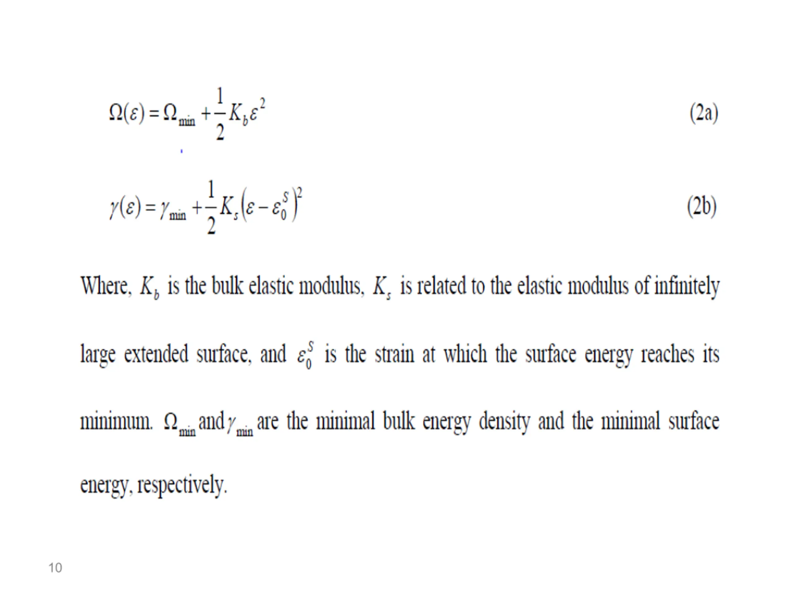 A. Effect of equilibrium strain The equilibrium bulk material has the lowest energy at the zero- strain state of the crystal lattices. However, the lowest-energy configuration of the surface layers does not necessary have the same lattice parameters as the zero-strain state of the bulk materials. This is because the arrangement and separation of atoms are different in the surface andin the bulk crystal. The bulk energy density ( ) and the surface energy ( ) can be written in the following forms. 9