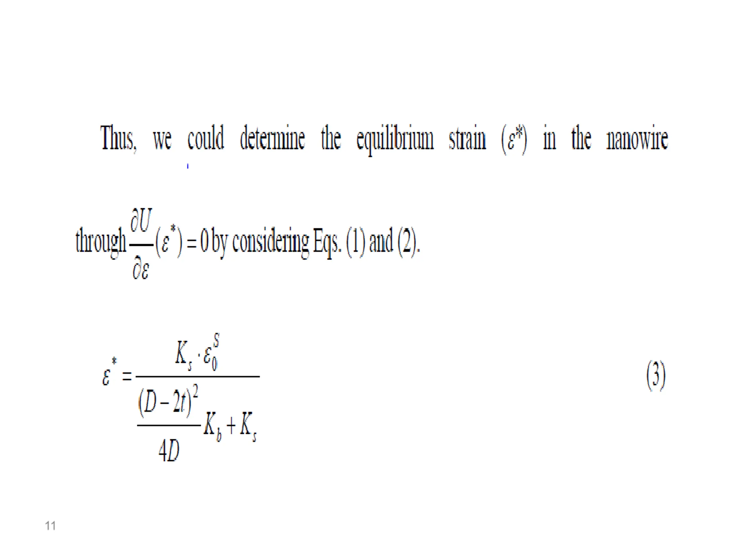 The existence of this equilibrium strain in the nanowires has already been revealed in molecular dynamics . The equilibrium strain would affect the elastic modulus of the core (bulk) region of the nanowires. If a nanowire is deformed by a strain from its equilibrium state (with an equilibrium strain *) under a load, then (note: is the strain with respect to the equilibrium crystal lattice). Hence, the Young s modulus contributed from the nanowire s core should be: 12