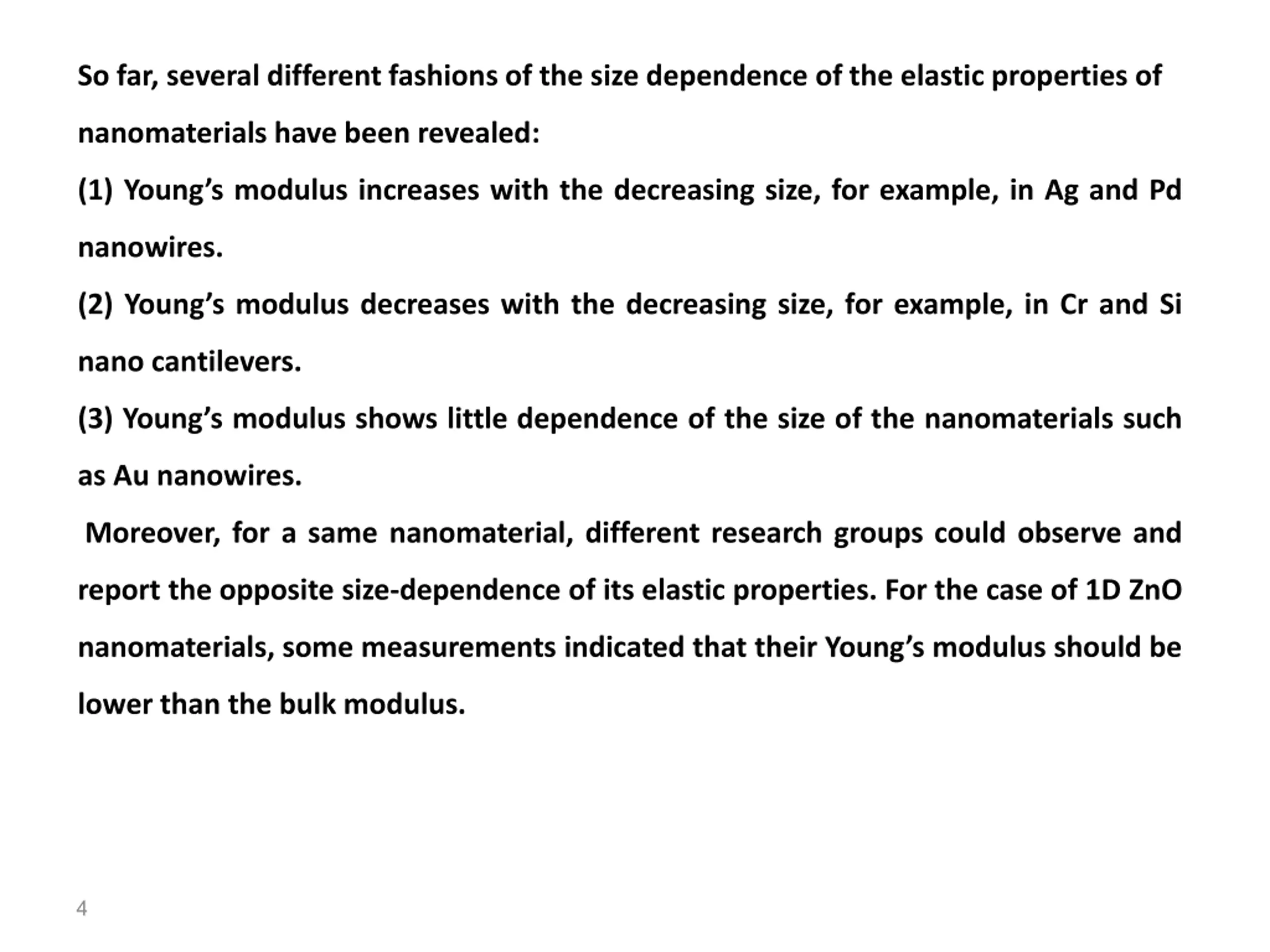 So far, several different fashions of the size dependence of the elastic properties of nanomaterials have been revealed: (1) Young s modulus increases with the decreasing size, for example, in Ag and Pd nanowires. (2) Young s modulus decreases with the decreasing size, for example, in Cr and Si nano cantilevers. (3) Young s modulus shows little dependence of the size of the nanomaterials such as Au nanowires. Moreover, for a same nanomaterial, different research groups could observe and report the opposite size-dependence of its elastic properties. For the case of 1D ZnO nanomaterials, some measurements indicated that their Young s modulus should be lower than the bulk modulus. 4