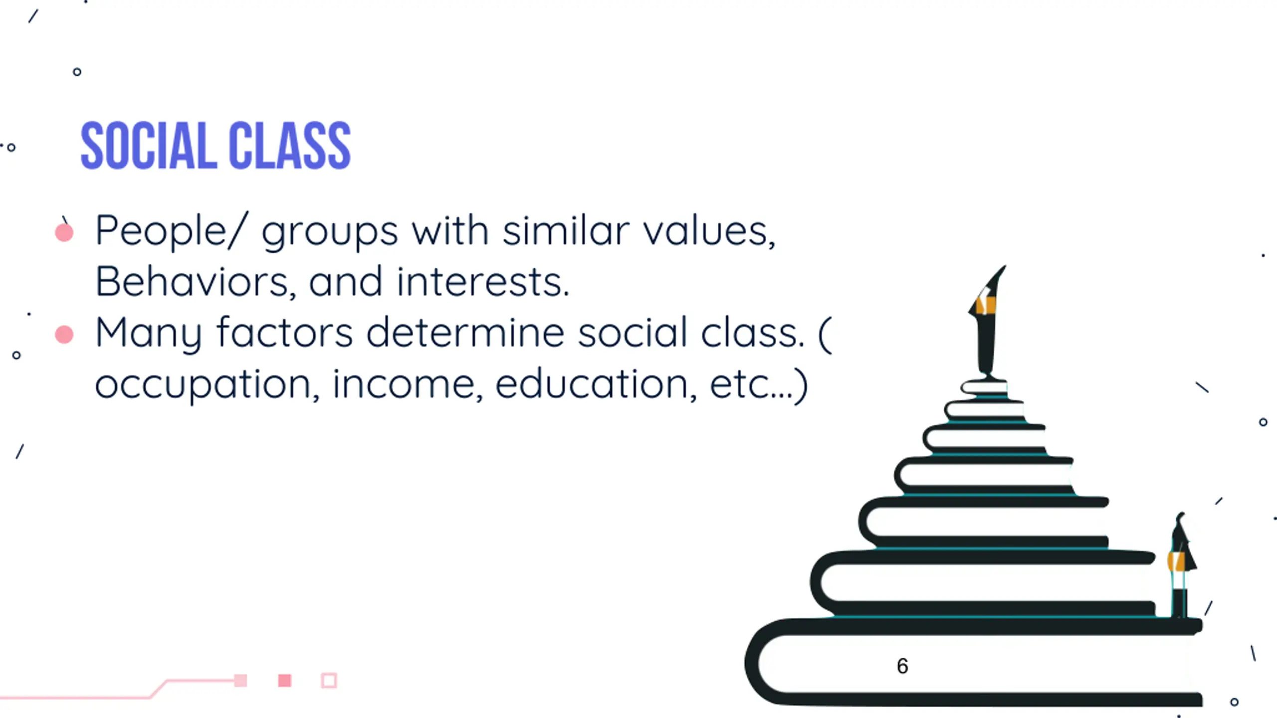 People/ groups with similar values, Behaviors, and interests. Many factors determine social class. ( occupation, income, education, etc ) 6