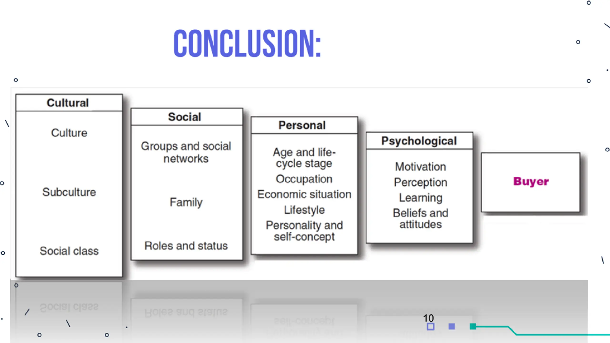 Consumer purchases are heavily influenced by cultural, personal, social, and psychological characteristics. Marketers can not control such factors but can take them into consideration. 3