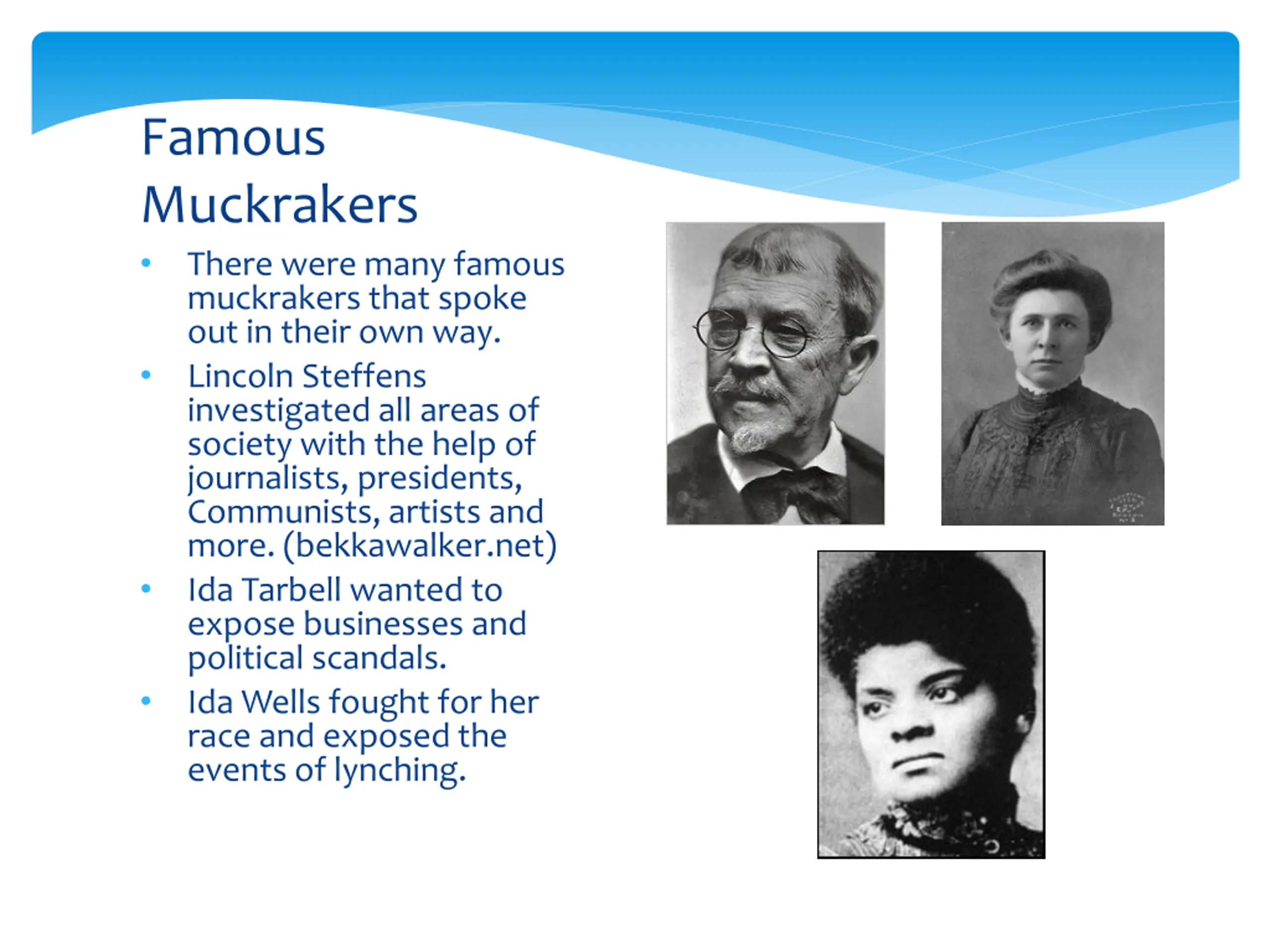 Famous Muckrakers There were many famous muckrakers that spoke out in their own way. Lincoln Steffens investigated all areas of society with the help of journalists, presidents, Communists, artists and more. (bekkawalker.net) Ida Tarbell wanted to expose businesses and political scandals. Ida Wells fought for her race and exposed the events of lynching.