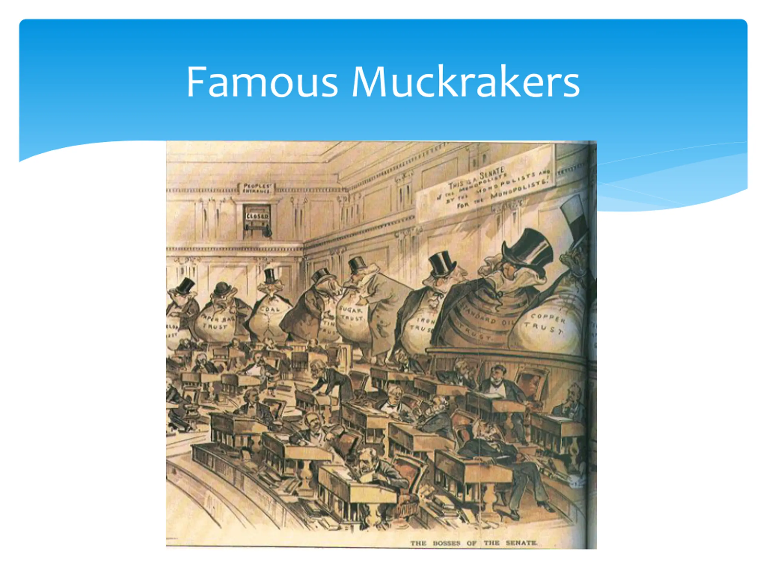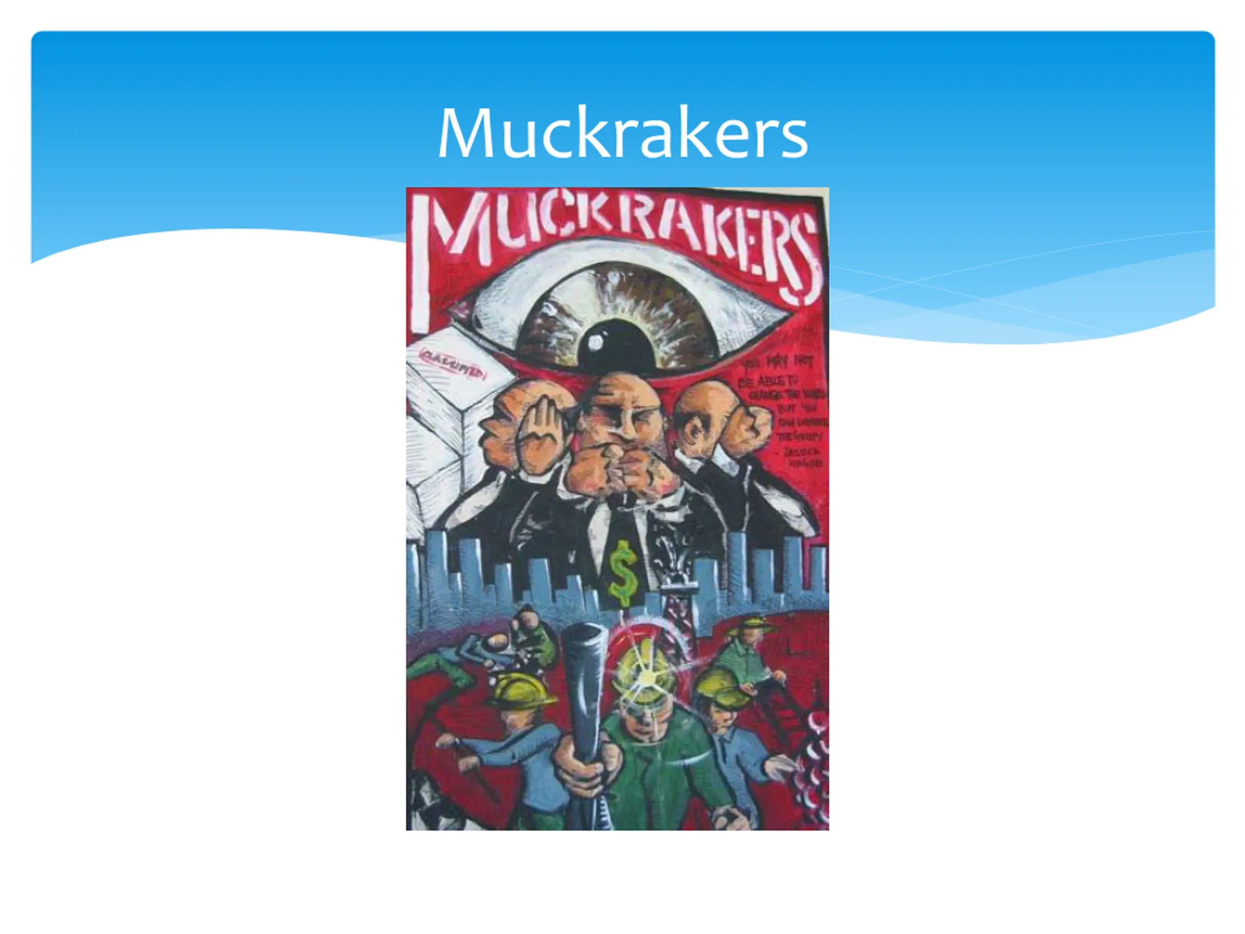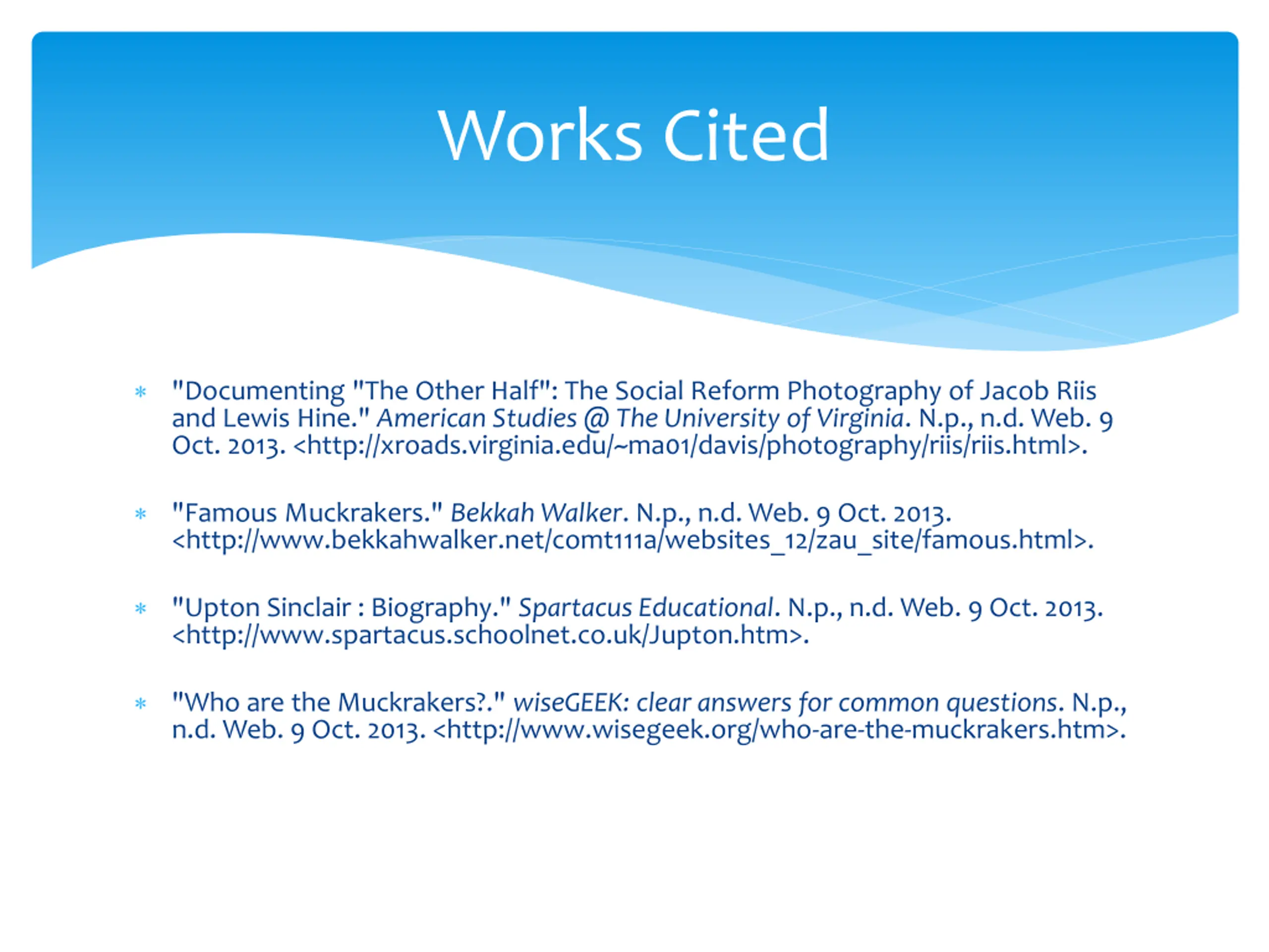 Works Cited "Documenting "The Other Half": The Social Reform Photography of Jacob Riis and Lewis Hine." American Studies @ The University of Virginia. N.p., n.d. Web. 9 Oct. 2013. <http://xroads.virginia.edu/~ma01/davis/photography/riis/riis.html>. "Famous Muckrakers." Bekkah Walker. N.p., n.d. Web. 9 Oct. 2013. <http://www.bekkahwalker.net/comt111a/websites_12/zau_site/famous.html>. "Upton Sinclair : Biography." Spartacus Educational. N.p., n.d. Web. 9 Oct. 2013. <http://www.spartacus.schoolnet.co.uk/Jupton.htm>. "Who are the Muckrakers?." wiseGEEK: clear answers for common questions. N.p., n.d. Web. 9 Oct. 2013. <http://www.wisegeek.org/who-are-the-muckrakers.htm>.