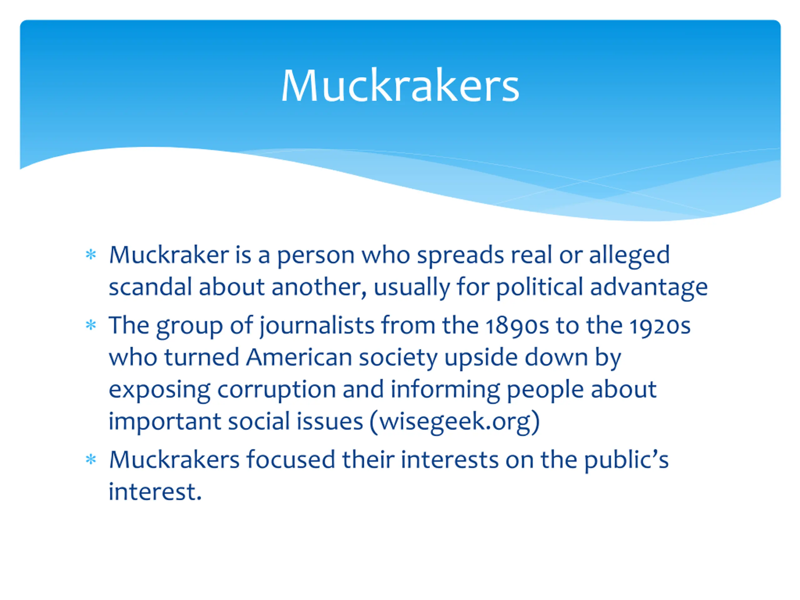 Muckrakers Muckraker is a person who spreads real or alleged scandal about another, usually for political advantage The group of journalists from the 1890s to the 1920s who turned American society upside down by exposing corruption and informing people about important social issues (wisegeek.org) Muckrakers focused their interests on the public s interest.