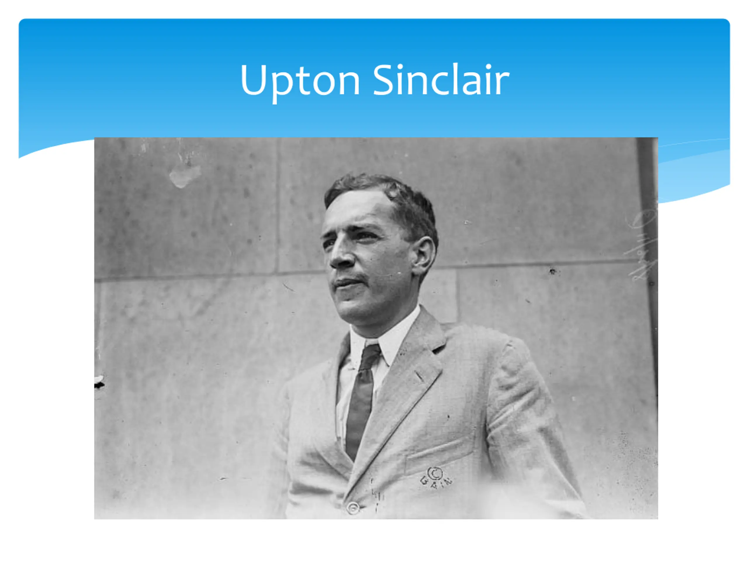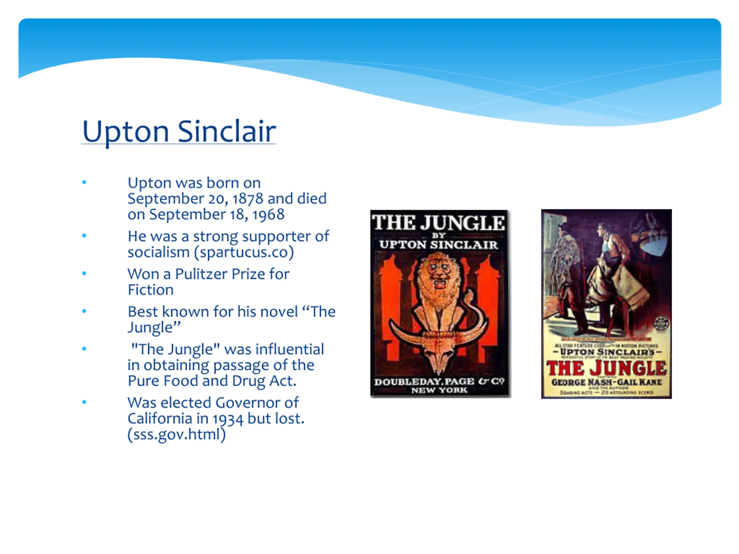 Upton Sinclair Upton was born on September 20, 1878 and died on September 18, 1968 He was a strong supporter of socialism (spartucus.co) Won a Pulitzer Prize for Fiction Best known for his novel The Jungle "The Jungle" was influential in obtaining passage of the Pure Food and Drug Act. Was elected Governor of California in 1934 but lost. (sss.gov.html)