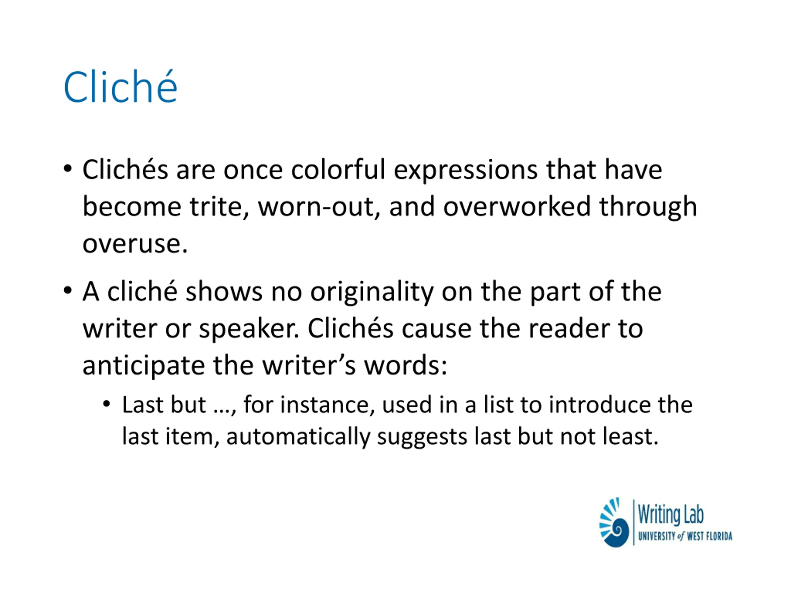 Clich Clich s are once colorful expressions that have become trite, worn-out, and overworked through overuse. A clich shows no originality on the part of the writer or speaker. Clich s cause the reader to anticipate the writer s words: Last but , for instance, used in a list to introduce the last item, automatically suggests last but not least.