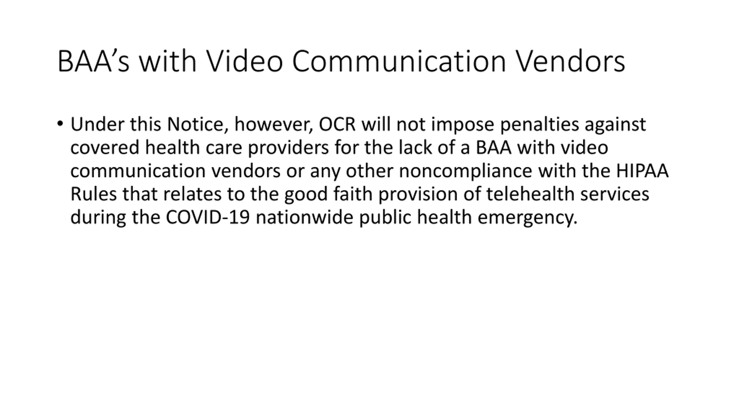 BAAs with Video Communication Vendors Under this Notice, however, OCR will not impose penalties against covered health care providers for the lack of a BAA with video communication vendors or any other noncompliance with the HIPAA Rules that relates to the good faith provision of telehealth services during the COVID-19 nationwide public health emergency.
