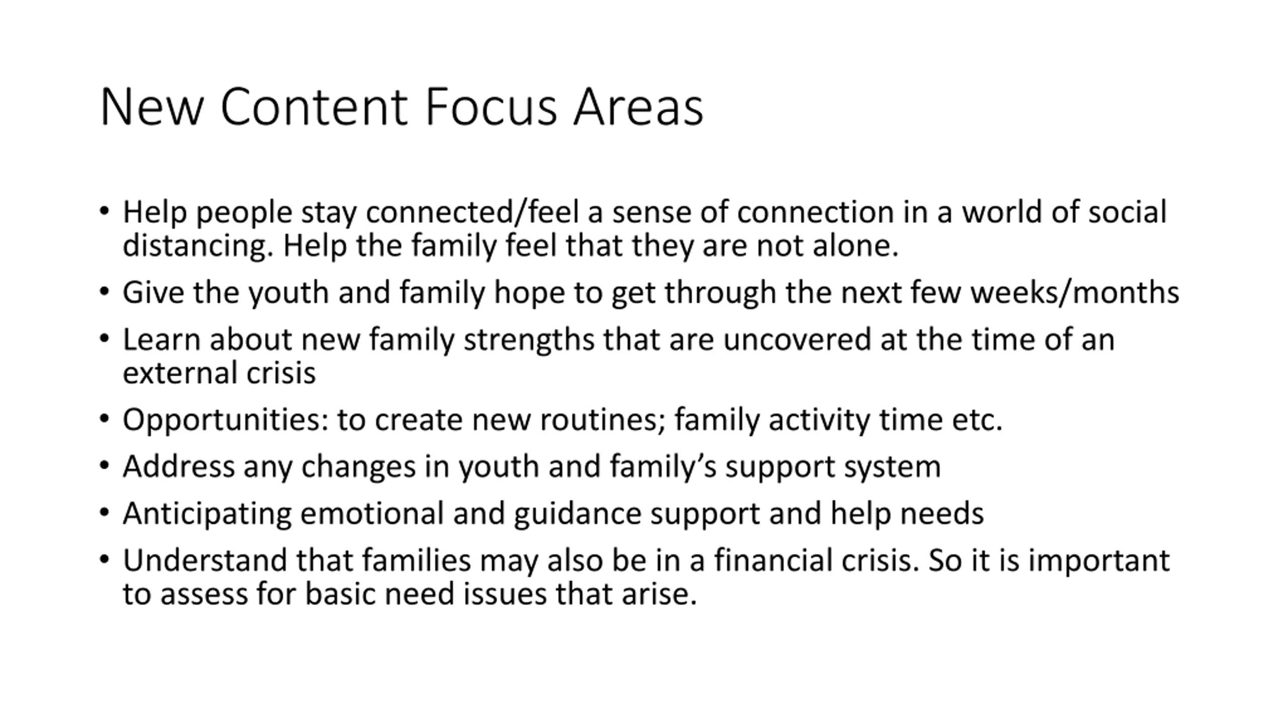 New Content Focus Areas Help people stay connected/feel a sense of connection in a world of social distancing. Help the family feel that they are not alone. Give the youth and family hope to get through the next few weeks/months Learn about new family strengths that are uncovered at the time of an external crisis Opportunities: to create new routines; family activity time etc. Address any changes in youth and family s support system Anticipating emotional and guidance support and help needs Understand that families may also be in a financial crisis. So it is important to assess for basic need issues that arise.