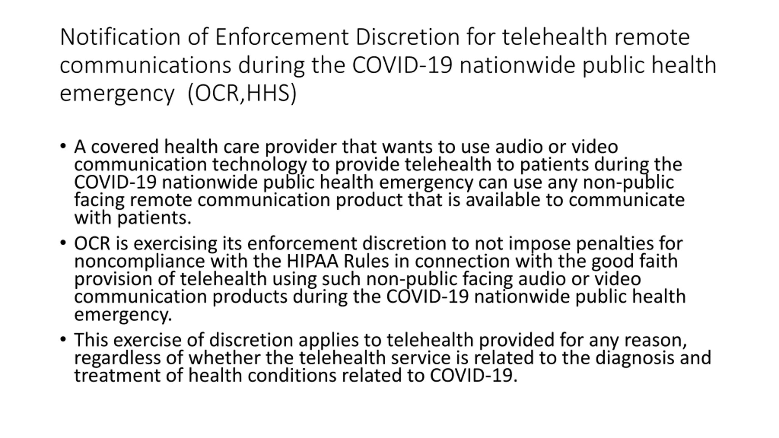 Notification of Enforcement Discretion for telehealth remote communications during the COVID-19 nationwide public health emergency (OCR,HHS) A covered health care provider that wants to use audio or video communication technology to provide telehealth to patients during the COVID-19 nationwide public health emergency can use any non-public facing remote communication product that is available to communicate with patients. OCR is exercising its enforcement discretion to not impose penalties for noncompliance with the HIPAA Rules in connection with the good faith provision of telehealth using such non-public facing audio or video communication products during the COVID-19 nationwide public health emergency. This exercise of discretion applies to telehealth provided for any reason, regardless of whether the telehealth service is related to the diagnosis and treatment of health conditions related to COVID-19.