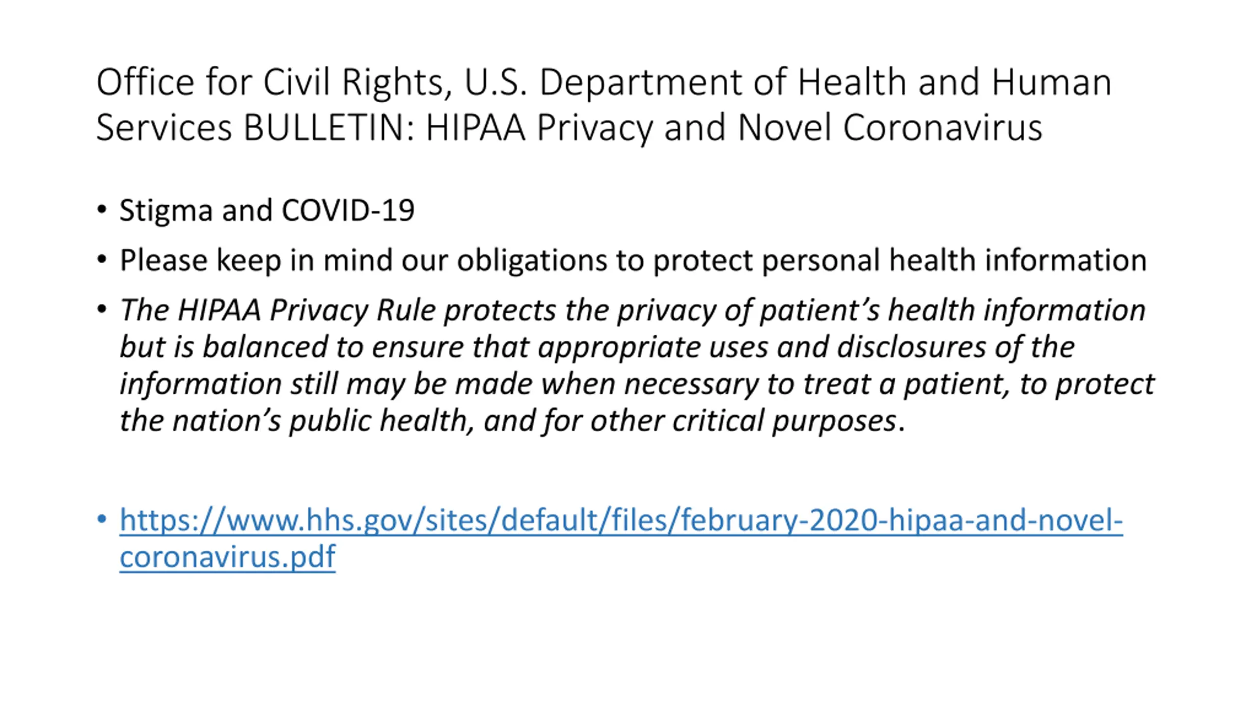 Office for Civil Rights, U.S. Department of Health and Human Services BULLETIN: HIPAA Privacy and Novel Coronavirus Stigma and COVID-19 Please keep in mind our obligations to protect personal health information The HIPAA Privacy Rule protects the privacy of patient s health information but is balanced to ensure that appropriate uses and disclosures of the information still may be made when necessary to treat a patient, to protect the nation s public health, and for other critical purposes. https://www.hhs.gov/sites/default/files/february-2020-hipaa-and-novel- coronavirus.pdf