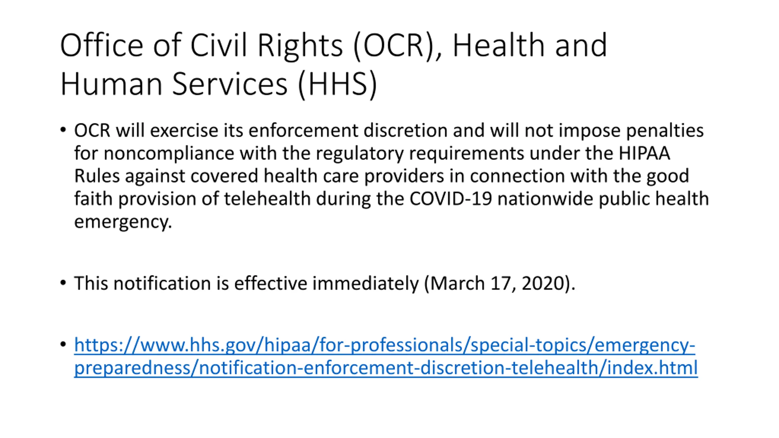 Office of Civil Rights (OCR), Health and Human Services (HHS) OCR will exercise its enforcement discretion and will not impose penalties for noncompliance with the regulatory requirements under the HIPAA Rules against covered health care providers in connection with the good faith provision of telehealth during the COVID-19 nationwide public health emergency. This notification is effective immediately (March 17, 2020). https://www.hhs.gov/hipaa/for-professionals/special-topics/emergency- preparedness/notification-enforcement-discretion-telehealth/index.html