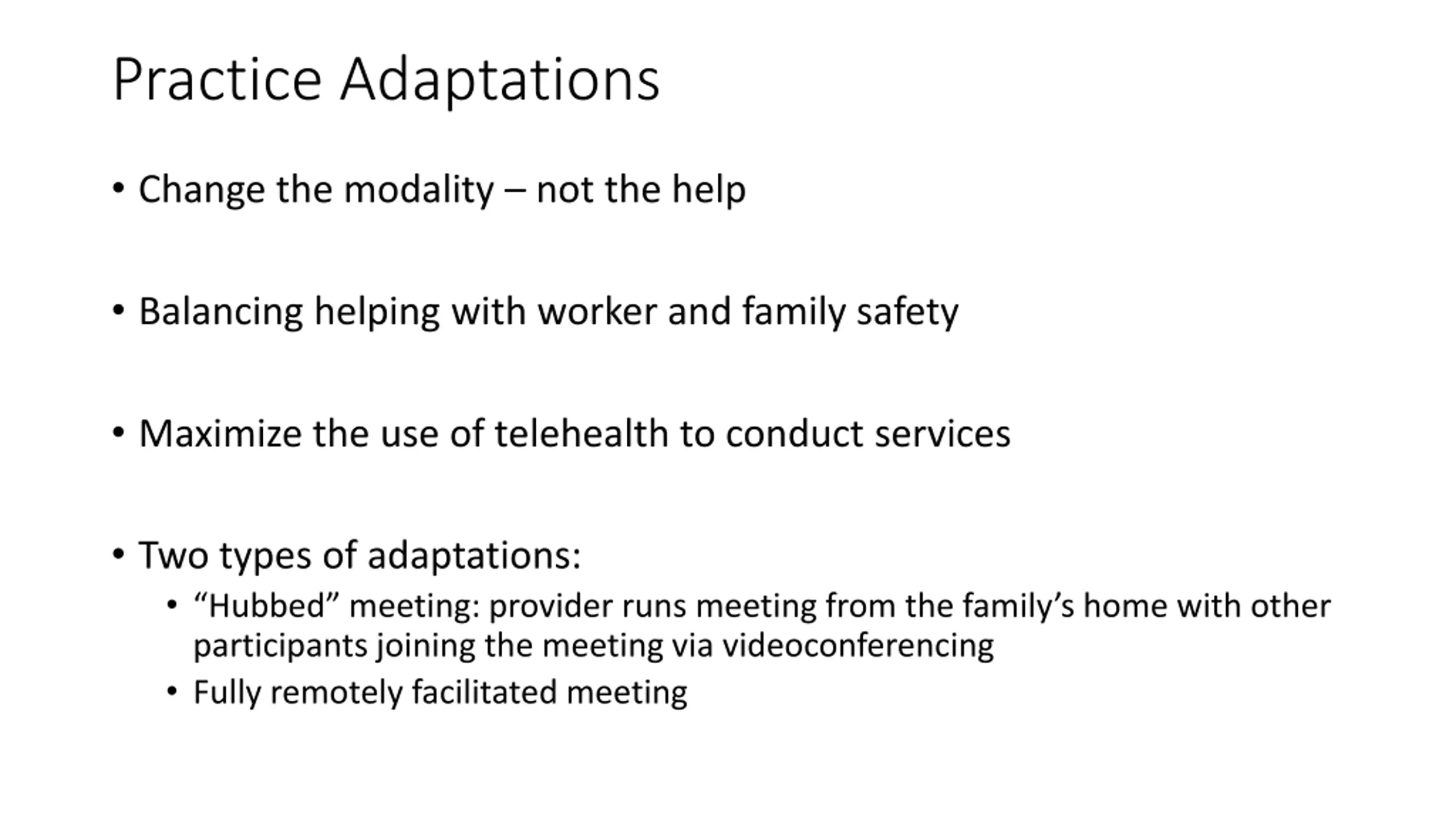 Practice Adaptations Change the modality not the help Balancing helping with worker and family safety Maximize the use of telehealth to conduct services Two types of adaptations: Hubbed meeting: provider runs meeting from the family s home with other participants joining the meeting via videoconferencing Fully remotely facilitated meeting