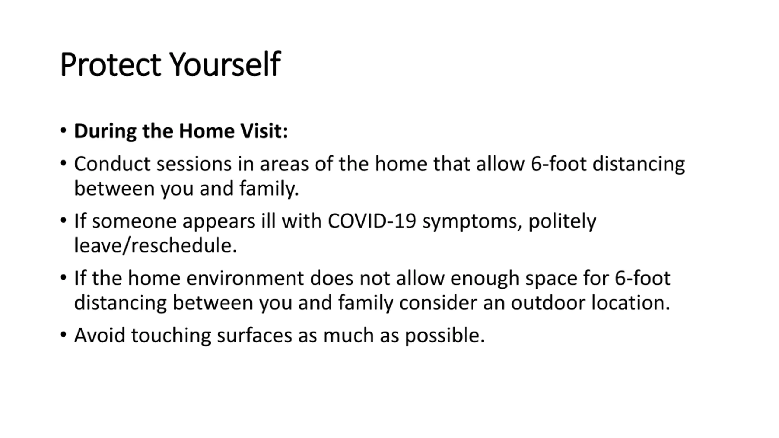 Protect Yourself Protect Yourself During the Home Visit: Conduct sessions in areas of the home that allow 6-foot distancing between you and family. If someone appears ill with COVID-19 symptoms, politely leave/reschedule. If the home environment does not allow enough space for 6-foot distancing between you and family consider an outdoor location. Avoid touching surfaces as much as possible.