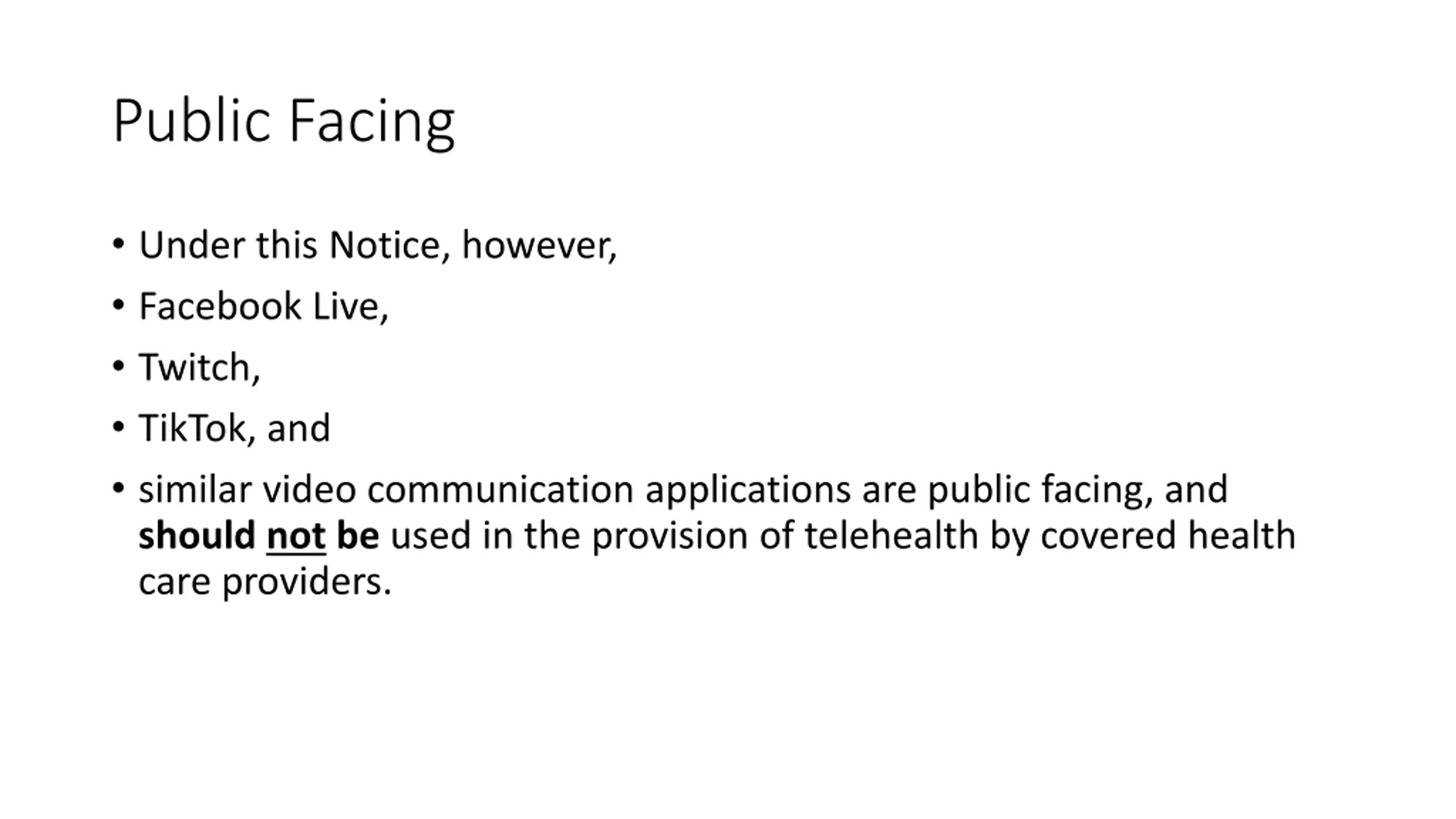 Public Facing Under this Notice, however, Facebook Live, Twitch, TikTok, and similar video communication applications are public facing, and should not be used in the provision of telehealth by covered health care providers.