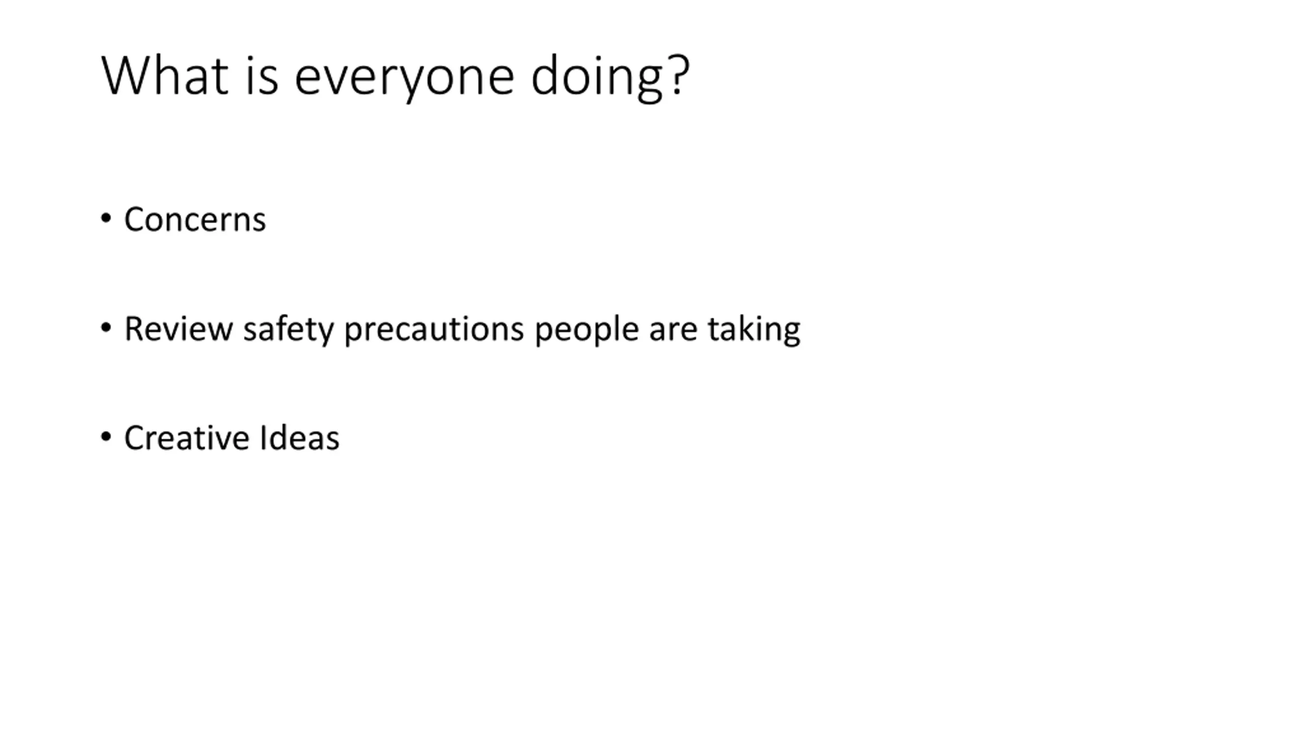 What is everyone doing? Concerns Review safety precautions people are taking Creative Ideas