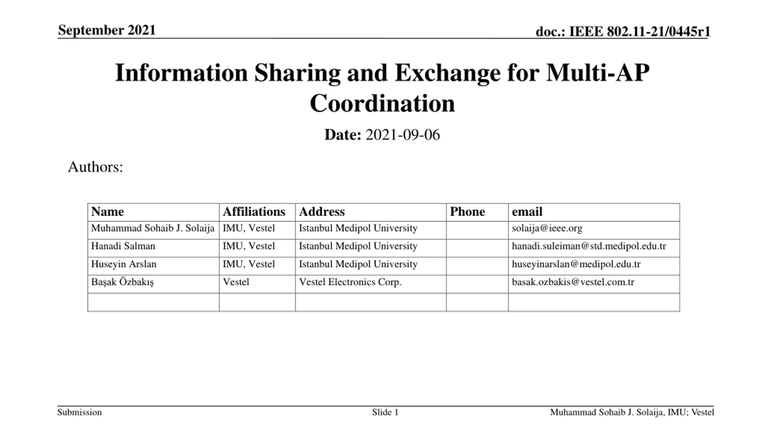 September 2021 doc.: IEEE 802.11-21/0445r1 Information Sharing and Exchange for Multi-AP Coordination Date: 2021-09-06 Authors: Name Muhammad Sohaib J. Solaija IMU, Vestel Affiliations Address Phone email solaija@ieee.org Istanbul Medipol University Hanadi Salman IMU, Vestel Istanbul Medipol University hanadi.suleiman@std.medipol.edu.tr Huseyin Arslan IMU, Vestel Istanbul Medipol University huseyinarslan@medipol.edu.tr Ba ak zbak Vestel Vestel Electronics Corp. basak.ozbakis@vestel.com.tr Submission Slide 1 Muhammad Sohaib J. Solaija, IMU; Vestel