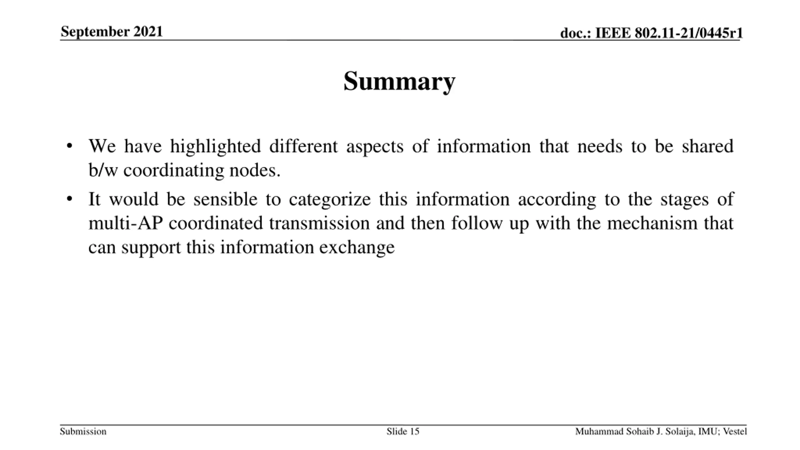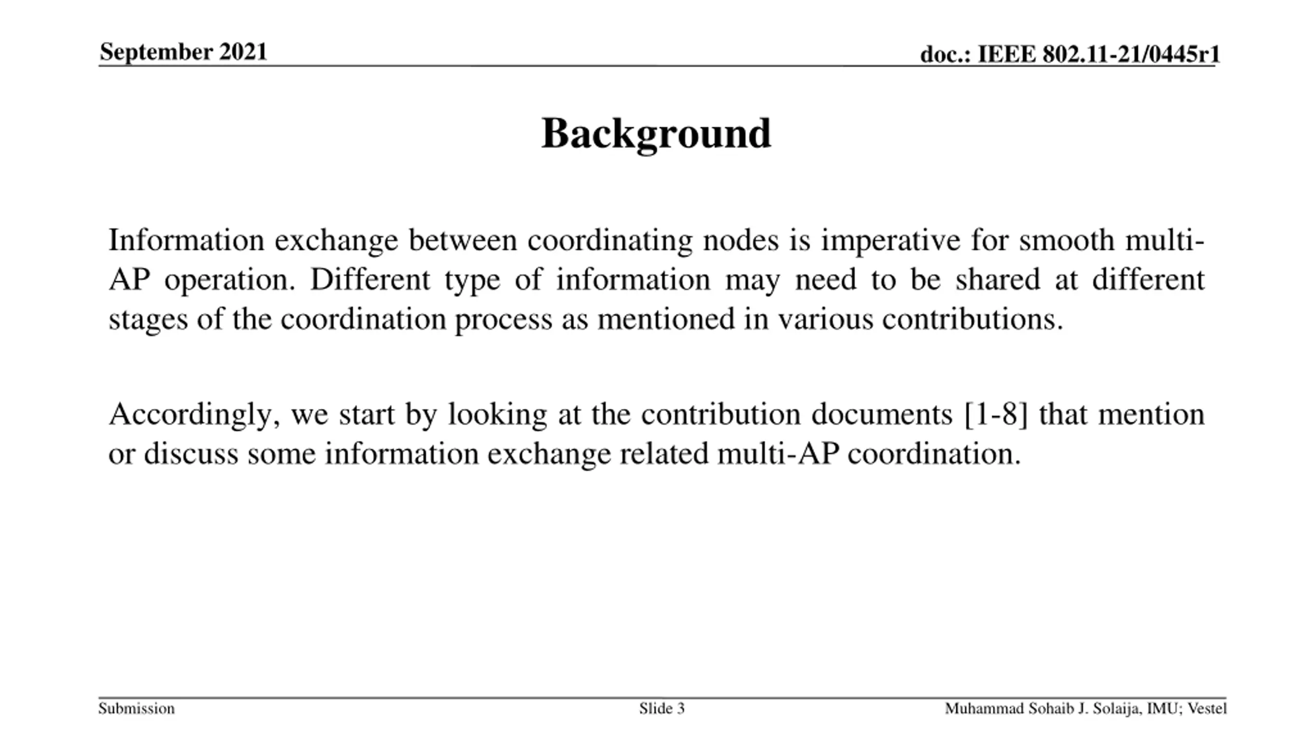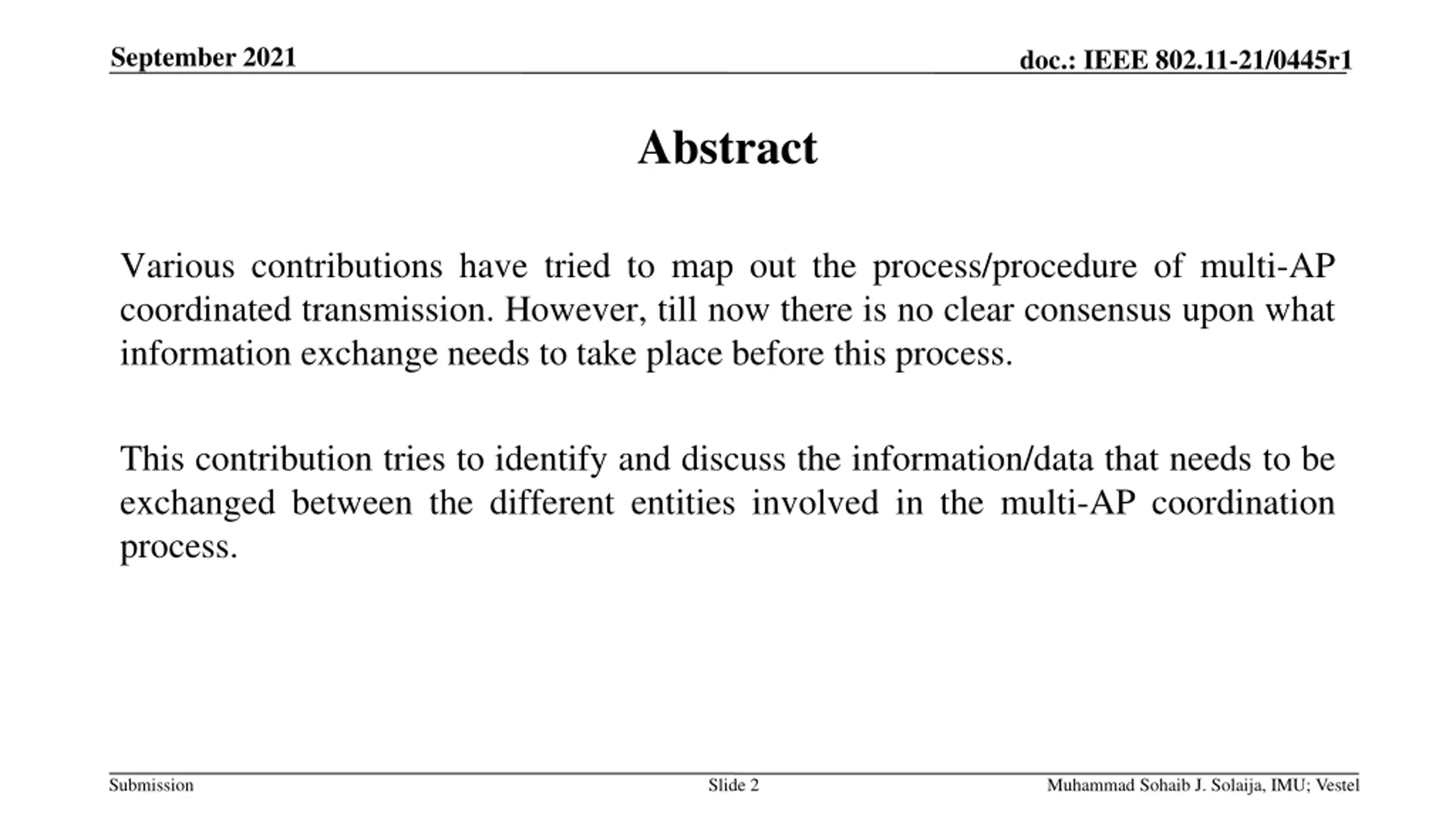 September 2021 doc.: IEEE 802.11-21/0445r1 Abstract Various contributions have tried to map out the process/procedure of multi-AP coordinated transmission. However, till now there is no clear consensus upon what information exchange needs to take place before this process. This contribution tries to identify and discuss the information/data that needs to be exchanged between the different entities involved in the multi-AP coordination process. Submission Slide 2 Muhammad Sohaib J. Solaija, IMU; Vestel