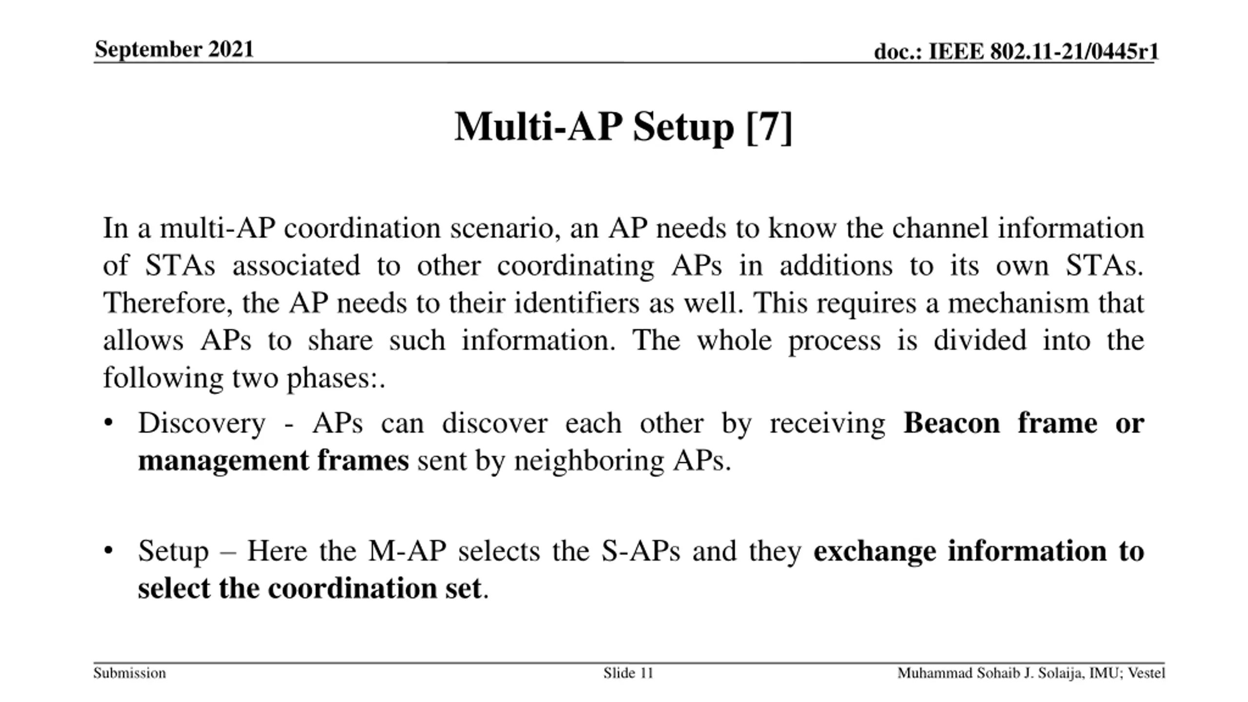 September 2021 doc.: IEEE 802.11-21/0445r1 Multi-AP Setup [7] In a multi-AP coordination scenario, an AP needs to know the channel information of STAs associated to other coordinating APs in additions to its own STAs. Therefore, the AP needs to their identifiers as well. This requires a mechanism that allows APs to share such information. The whole process is divided into the following two phases:. Discovery - APs can discover each other by receiving Beacon frame or management frames sent by neighboring APs. Setup Here the M-AP selects the S-APs and they exchange information to select the coordination set. Submission Slide 11 Muhammad Sohaib J. Solaija, IMU; Vestel