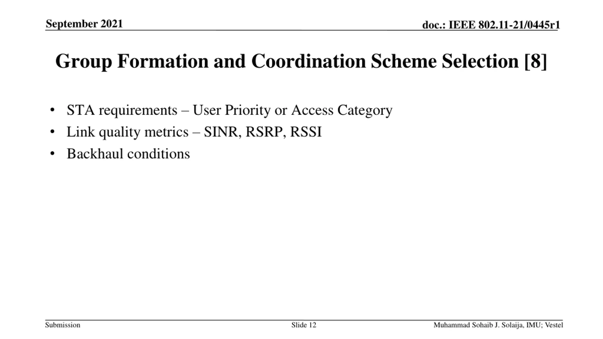 September 2021 doc.: IEEE 802.11-21/0445r1 Group Formation and Coordination Scheme Selection [8] STA requirements User Priority or Access Category Link quality metrics SINR, RSRP, RSSI Backhaul conditions Submission Slide 12 Muhammad Sohaib J. Solaija, IMU; Vestel