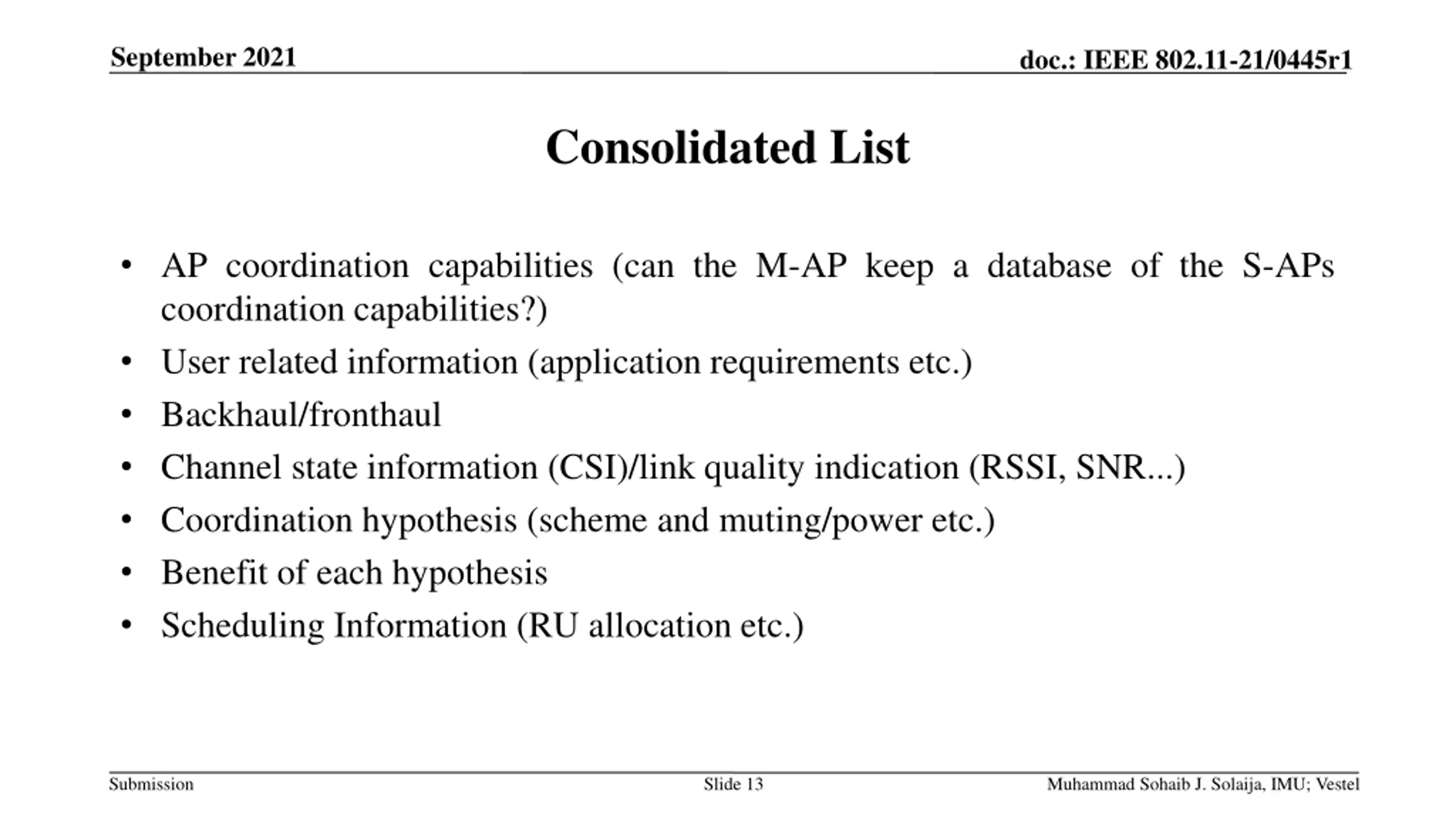September 2021 doc.: IEEE 802.11-21/0445r1 Consolidated List AP coordination capabilities (can the M-AP keep a database of the S-APs coordination capabilities?) User related information (application requirements etc.) Backhaul/fronthaul Channel state information (CSI)/link quality indication (RSSI, SNR...) Coordination hypothesis (scheme and muting/power etc.) Benefit of each hypothesis Scheduling Information (RU allocation etc.) Submission Slide 13 Muhammad Sohaib J. Solaija, IMU; Vestel