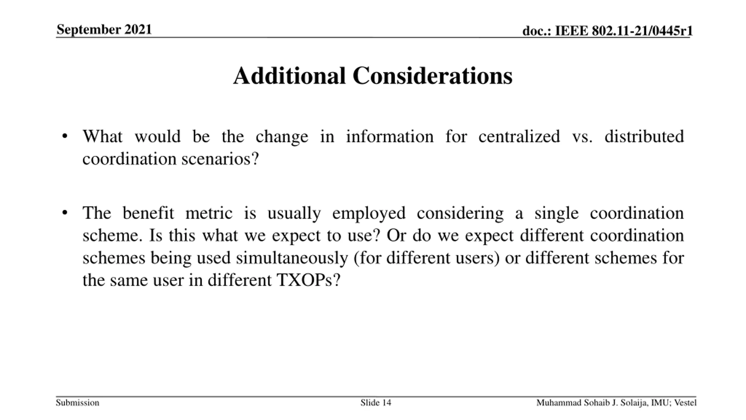 September 2021 doc.: IEEE 802.11-21/0445r1 Additional Considerations What would be the change in information for centralized vs. distributed coordination scenarios? The benefit metric is usually employed considering a single coordination scheme. Is this what we expect to use? Or do we expect different coordination schemes being used simultaneously (for different users) or different schemes for the same user in different TXOPs? Submission Slide 14 Muhammad Sohaib J. Solaija, IMU; Vestel
