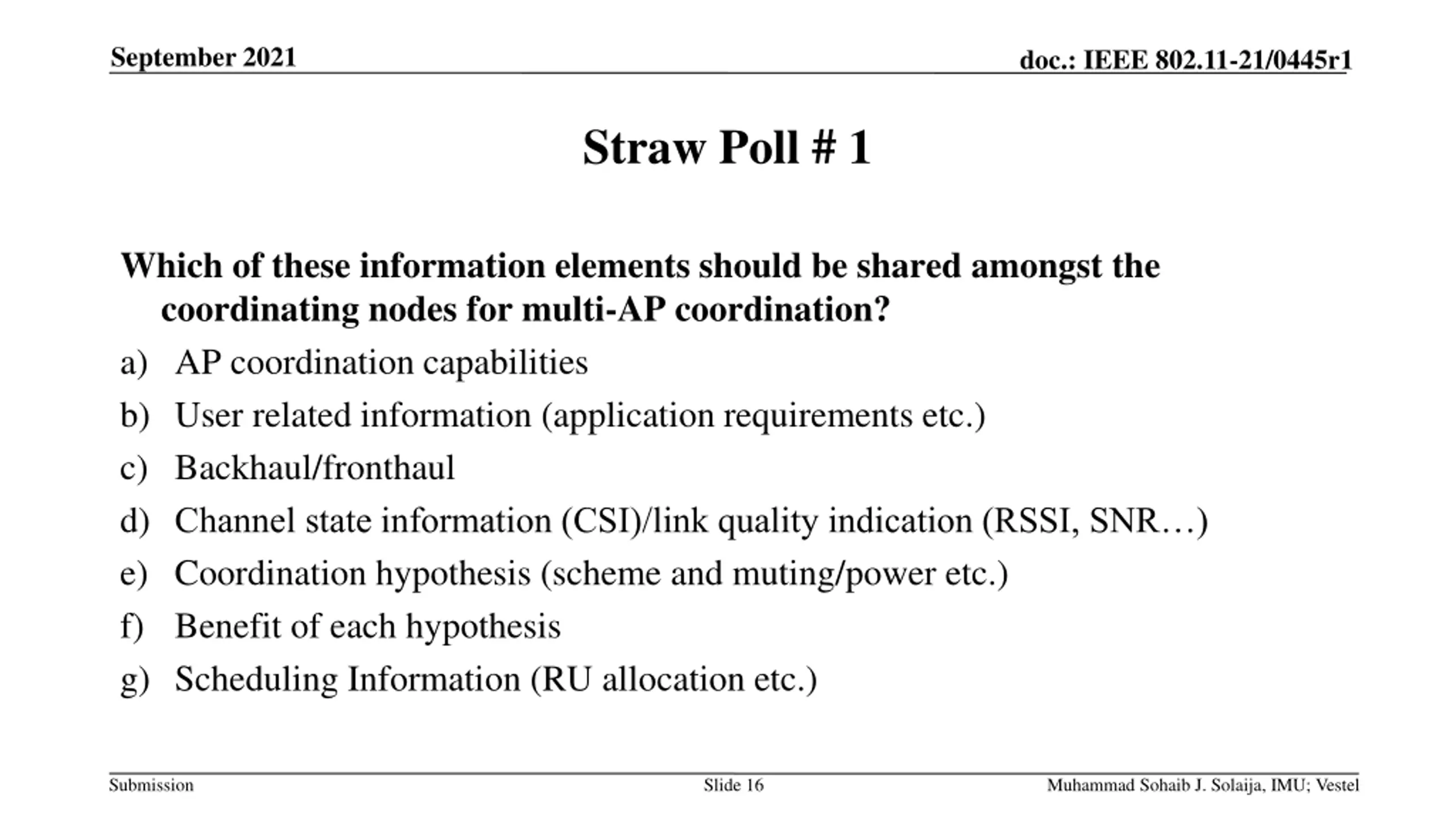September 2021 doc.: IEEE 802.11-21/0445r1 Straw Poll # 1 Which of these information elements should be shared amongst the coordinating nodes for multi-AP coordination? a) AP coordination capabilities b) User related information (application requirements etc.) c) Backhaul/fronthaul d) Channel state information (CSI)/link quality indication (RSSI, SNR ) e) Coordination hypothesis (scheme and muting/power etc.) f) Benefit of each hypothesis g) Scheduling Information (RU allocation etc.) Submission Slide 16 Muhammad Sohaib J. Solaija, IMU; Vestel