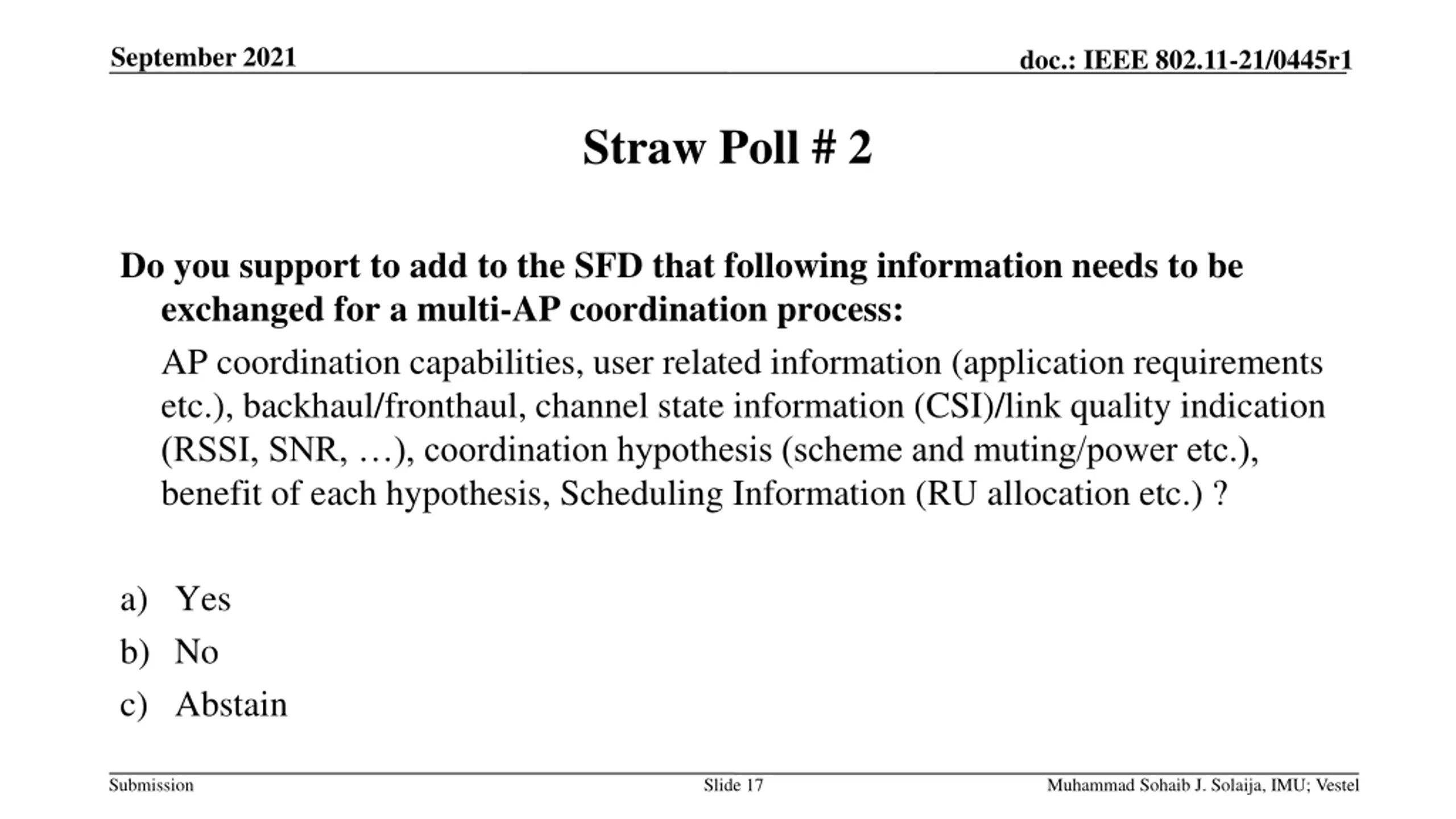 September 2021 doc.: IEEE 802.11-21/0445r1 Straw Poll # 2 Do you support to add to the SFD that following information needs to be exchanged for a multi-AP coordination process: AP coordination capabilities, user related information (application requirements etc.), backhaul/fronthaul, channel state information (CSI)/link quality indication (RSSI, SNR, ), coordination hypothesis (scheme and muting/power etc.), benefit of each hypothesis, Scheduling Information (RU allocation etc.) ? a) Yes b) No c) Abstain Submission Slide 17 Muhammad Sohaib J. Solaija, IMU; Vestel