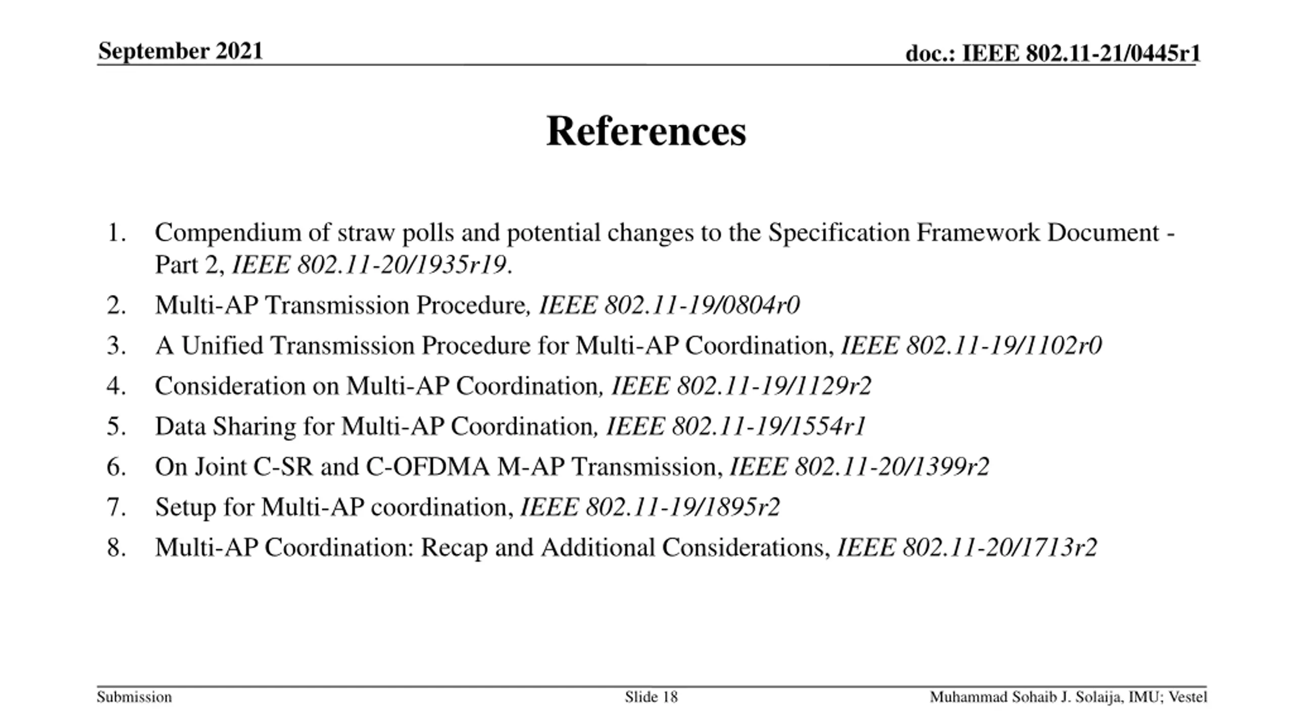 September 2021 doc.: IEEE 802.11-21/0445r1 References 1. Compendium of straw polls and potential changes to the Specification Framework Document - Part 2, IEEE 802.11-20/1935r19. Multi-AP Transmission Procedure, IEEE 802.11-19/0804r0 A Unified Transmission Procedure for Multi-AP Coordination, IEEE 802.11-19/1102r0 Consideration on Multi-AP Coordination, IEEE 802.11-19/1129r2 Data Sharing for Multi-AP Coordination, IEEE 802.11-19/1554r1 On Joint C-SR and C-OFDMA M-AP Transmission, IEEE 802.11-20/1399r2 Setup for Multi-AP coordination, IEEE802.11-19/1895r2 Multi-AP Coordination: Recap and Additional Considerations, IEEE 802.11-20/1713r2 2. 3. 4. 5. 6. 7. 8. Submission Slide 18 Muhammad Sohaib J. Solaija, IMU; Vestel
