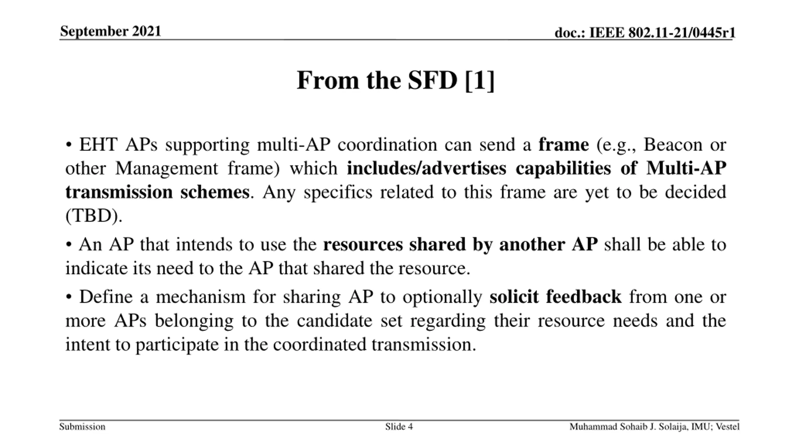 September 2021 doc.: IEEE 802.11-21/0445r1 From the SFD [1] EHT APs supporting multi-AP coordination can send a frame (e.g., Beacon or other Management frame) which includes/advertises capabilities of Multi-AP transmission schemes. Any specifics related to this frame are yet to be decided (TBD). An AP that intends to use the resources shared by another AP shall be able to indicate its need to the AP that shared the resource. Define a mechanism for sharing AP to optionally solicit feedback from one or more APs belonging to the candidate set regarding their resource needs and the intent to participate in the coordinated transmission. Submission Slide 4 Muhammad Sohaib J. Solaija, IMU; Vestel