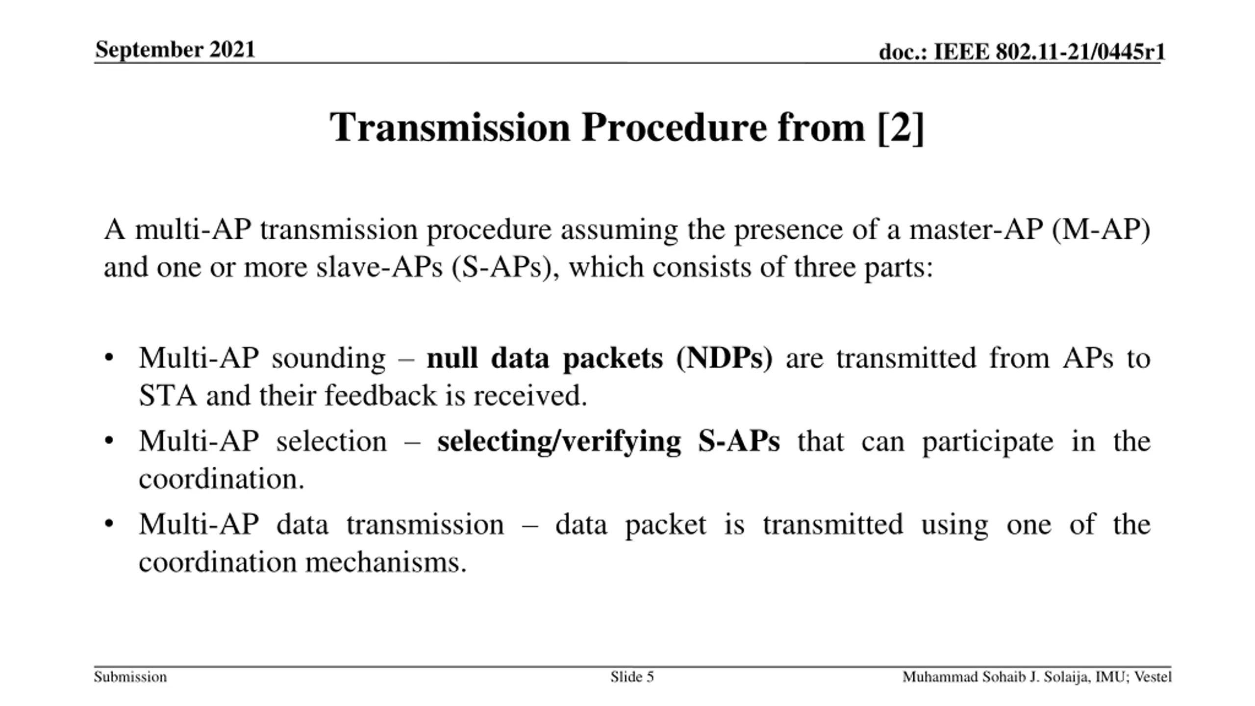 September 2021 doc.: IEEE 802.11-21/0445r1 Transmission Procedure from [2] A multi-AP transmission procedure assuming the presence of a master-AP (M-AP) and one or more slave-APs (S-APs), which consists of three parts: Multi-AP sounding null data packets (NDPs) are transmitted from APs to STA and their feedback is received. Multi-AP selection selecting/verifying S-APs that can participate in the coordination. Multi-AP data transmission data packet is transmitted using one of the coordination mechanisms. Submission Slide 5 Muhammad Sohaib J. Solaija, IMU; Vestel