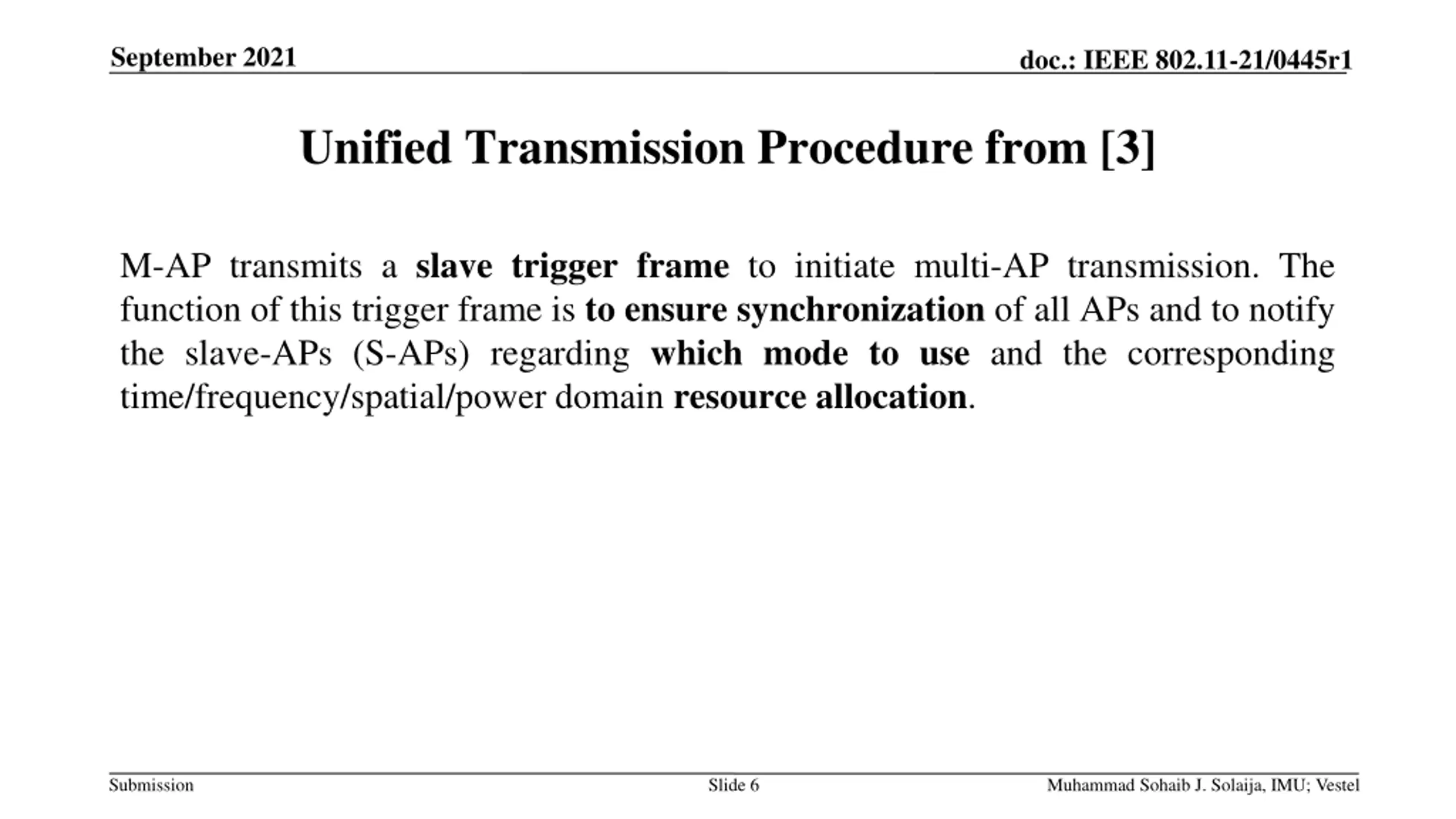 September 2021 doc.: IEEE 802.11-21/0445r1 Unified Transmission Procedure from [3] M-AP transmits a slave trigger frame to initiate multi-AP transmission. The function of this trigger frame is to ensure synchronization of all APs and to notify the slave-APs (S-APs) regarding which mode to use and the corresponding time/frequency/spatial/power domain resource allocation. Submission Slide 6 Muhammad Sohaib J. Solaija, IMU; Vestel