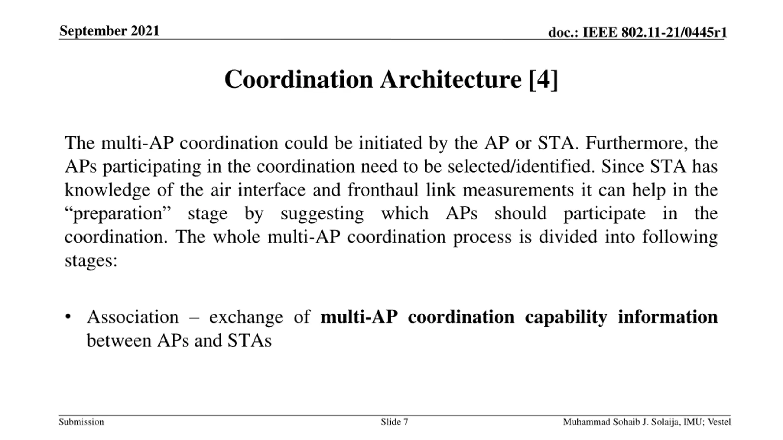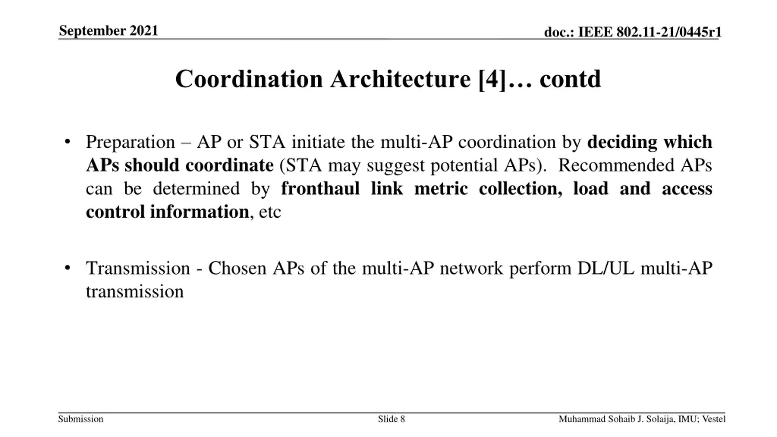 September 2021 doc.: IEEE 802.11-21/0445r1 Coordination Architecture [4] The multi-AP coordination could be initiated by the AP or STA. Furthermore, the APs participating in the coordination need to be selected/identified. Since STA has knowledge of the air interface and fronthaul link measurements it can help in the preparation stage by suggesting which APs should participate in the coordination. The whole multi-AP coordination process is divided into following stages: Association exchange of multi-AP coordination capability information between APs and STAs Submission Slide 7 Muhammad Sohaib J. Solaija, IMU; Vestel