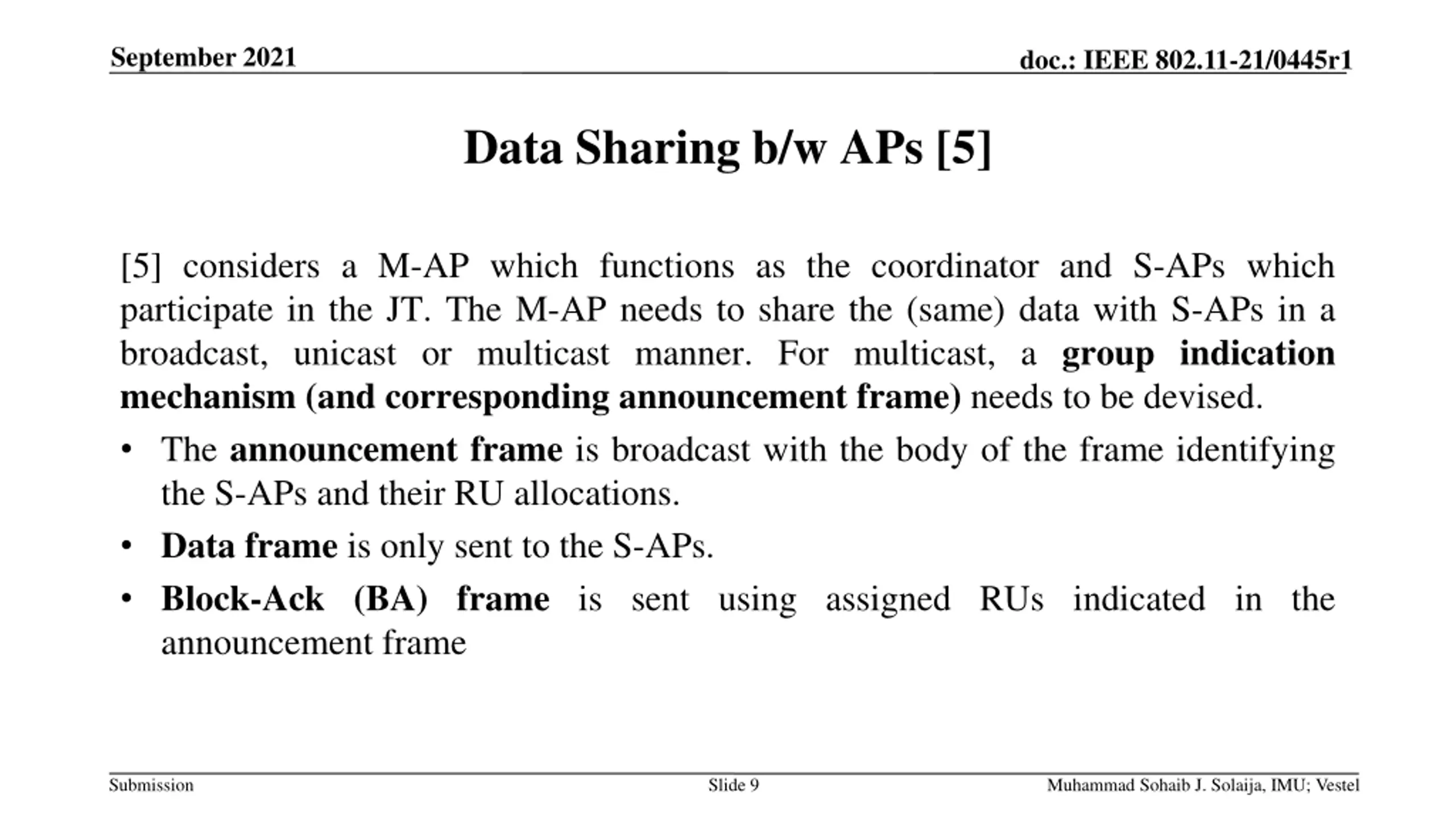 September 2021 doc.: IEEE 802.11-21/0445r1 Data Sharing b/w APs [5] [5] considers a M-AP which functions as the coordinator and S-APs which participate in the JT. The M-AP needs to share the (same) data with S-APs in a broadcast, unicast or multicast manner. For multicast, a group indication mechanism (and corresponding announcement frame) needs to be devised. The announcement frame is broadcast with the body of the frame identifying the S-APs and their RU allocations. Data frame is only sent to the S-APs. Block-Ack (BA) frame is sent using assigned RUs indicated in the announcement frame Submission Slide 9 Muhammad Sohaib J. Solaija, IMU; Vestel
