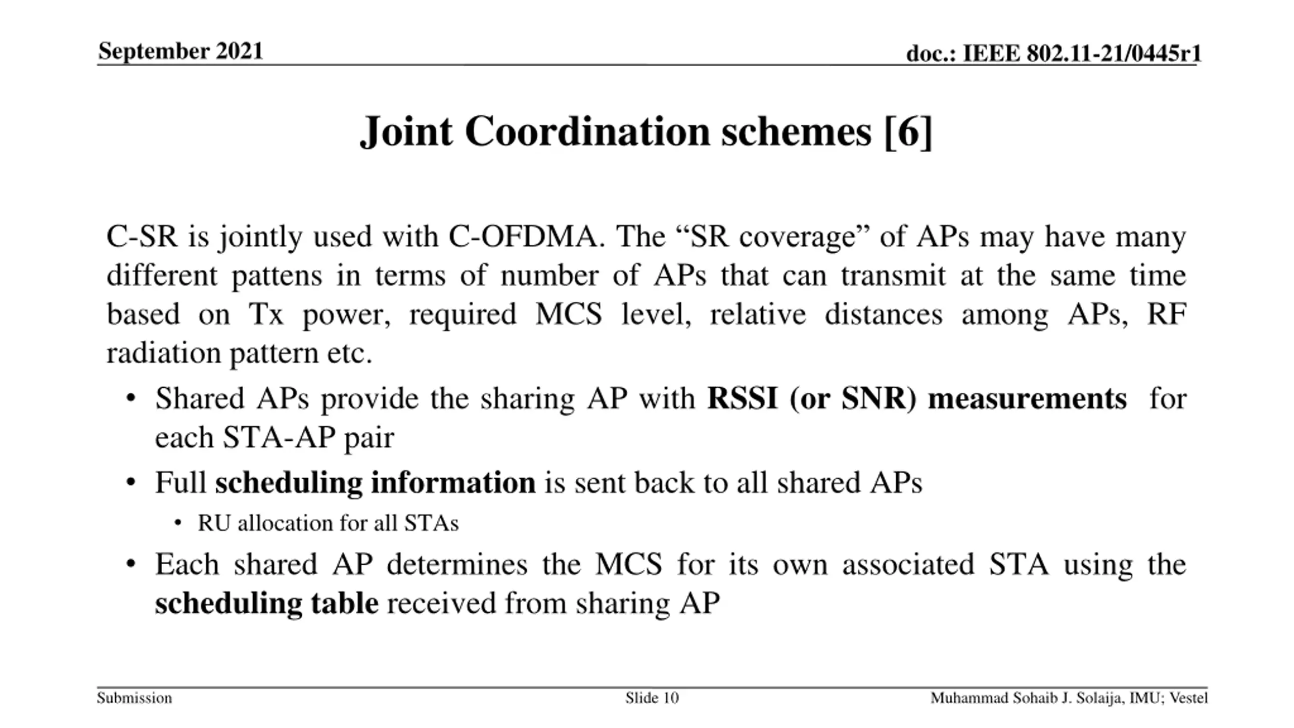 September 2021 doc.: IEEE 802.11-21/0445r1 Joint Coordination schemes [6] C-SR is jointly used with C-OFDMA. The SRcoverage of APs may have many different pattens in terms of number of APs that can transmit at the same time based on Tx power, required MCS level, relative distances among APs, RF radiation pattern etc. Shared APs provide the sharing AP with RSSI (or SNR) measurements for each STA-AP pair Full scheduling information is sent back to all shared APs RU allocation for all STAs Each shared AP determines the MCS for its own associated STA using the scheduling table received from sharing AP Submission Slide 10 Muhammad Sohaib J. Solaija, IMU; Vestel