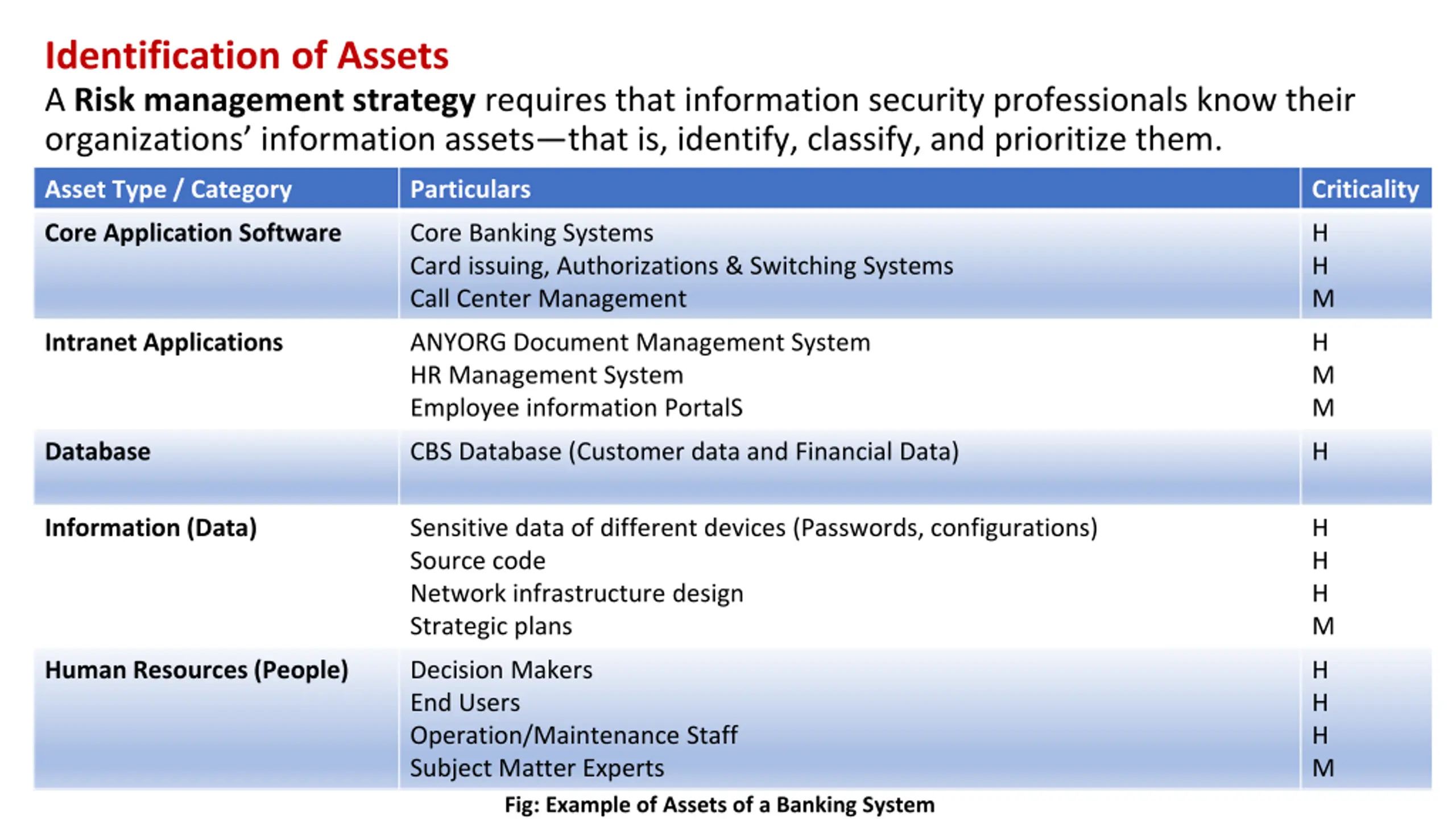 Identification of Assets A Risk management strategy requires that information security professionals know their organizations information assets that is, identify, classify, and prioritize them. Asset Type / Category Particulars Criticality Core Application Software Core Banking Systems Card issuing, Authorizations & Switching Systems Call Center Management H H M Intranet Applications ANYORG Document Management System HR Management System Employee information PortalS H M M Database CBS Database (Customer data and Financial Data) H Information (Data) Sensitive data of different devices (Passwords, configurations) Source code Network infrastructure design Strategic plans H H H M Human Resources (People) Decision Makers End Users Operation/Maintenance Staff Subject Matter Experts Fig: Example of Assets of a Banking System H H H M