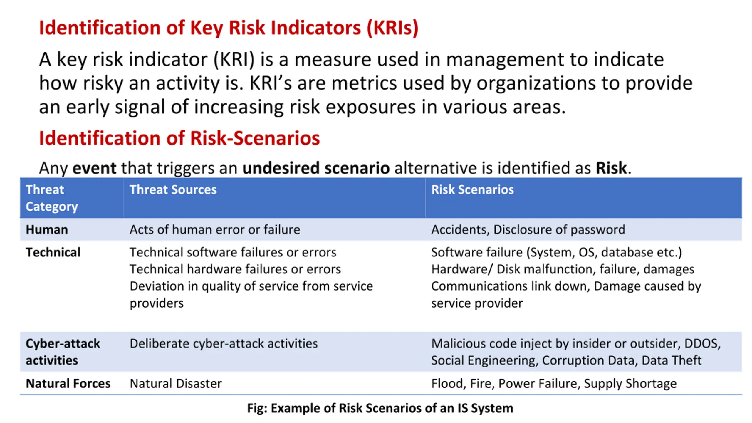 Identification of Key Risk Indicators (KRIs) A key risk indicator (KRI) is a measure used in management to indicate how risky an activity is. KRI s are metrics used by organizations to provide an early signal of increasing risk exposures in various areas. Identification of Risk-Scenarios Any event that triggers an undesired scenario alternative is identified as Risk. Threat Category Threat Sources Risk Scenarios Human Acts of human error or failure Accidents, Disclosure of password Technical Technical software failures or errors Technical hardware failures or errors Deviation in quality of service from service providers Software failure (System, OS, database etc.) Hardware/ Disk malfunction, failure, damages Communications link down, Damage caused by service provider Cyber-attack activities Deliberate cyber-attack activities Malicious code inject by insider or outsider, DDOS, Social Engineering, Corruption Data, Data Theft Natural Forces Natural Disaster Flood, Fire, Power Failure, Supply Shortage Fig: Example of Risk Scenarios of an IS System