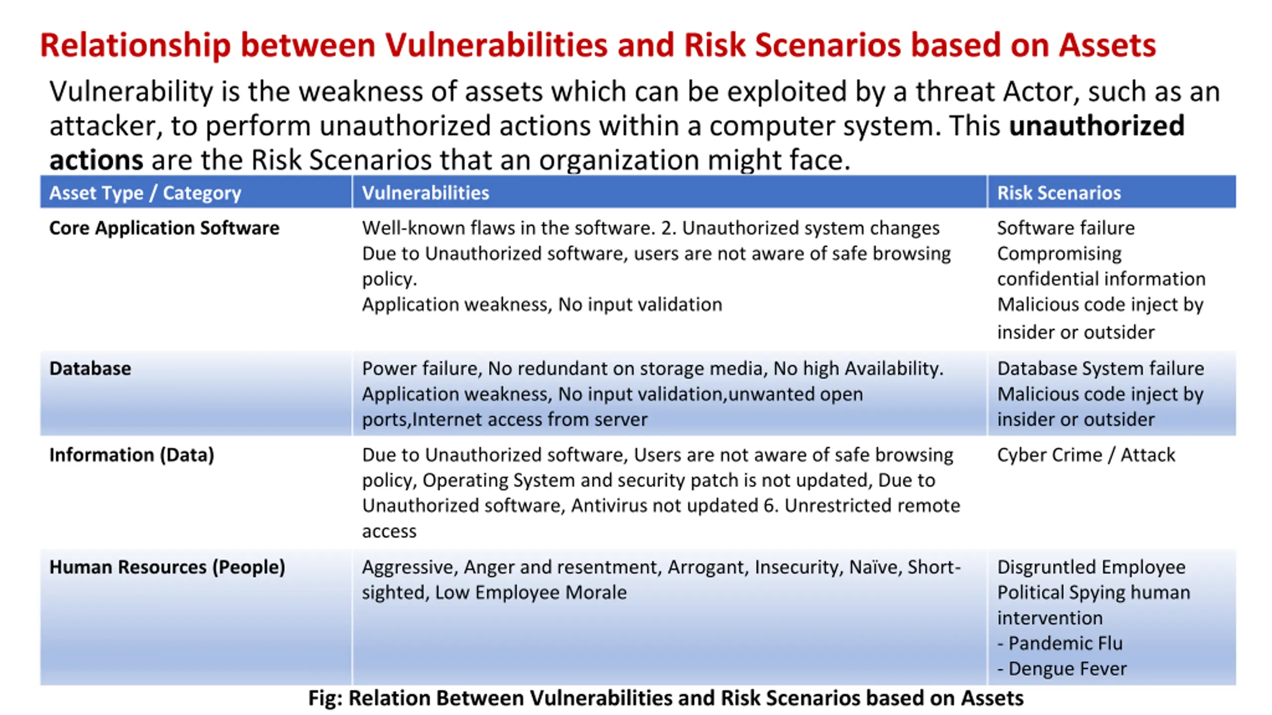 Relationship between Vulnerabilities and Risk Scenarios based on Assets Vulnerability is the weakness of assets which can be exploited by a threat Actor, such as an attacker, to perform unauthorized actions within a computer system. This unauthorized actions are the Risk Scenarios that an organization might face. Asset Type / Category Vulnerabilities Risk Scenarios Core Application Software Well-known flaws in the software. 2. Unauthorized system changes Due to Unauthorized software, users are not aware of safe browsing policy. Application weakness, No input validation Software failure Compromising confidential information Malicious code inject by insider or outsider Database Power failure, No redundant on storage media, No high Availability. Application weakness, No input validation,unwanted open ports,Internet access from server Database System failure Malicious code inject by insider or outsider Information (Data) Due to Unauthorized software, Users are not aware of safe browsing policy, Operating System and security patch is not updated, Due to Unauthorized software, Antivirus not updated 6. Unrestricted remote access Cyber Crime / Attack Human Resources (People) Aggressive, Anger and resentment, Arrogant, Insecurity, Na ve, Short- sighted, Low Employee Morale Disgruntled Employee Political Spying human intervention - Pandemic Flu - Dengue Fever Fig: Relation Between Vulnerabilities and Risk Scenarios based on Assets