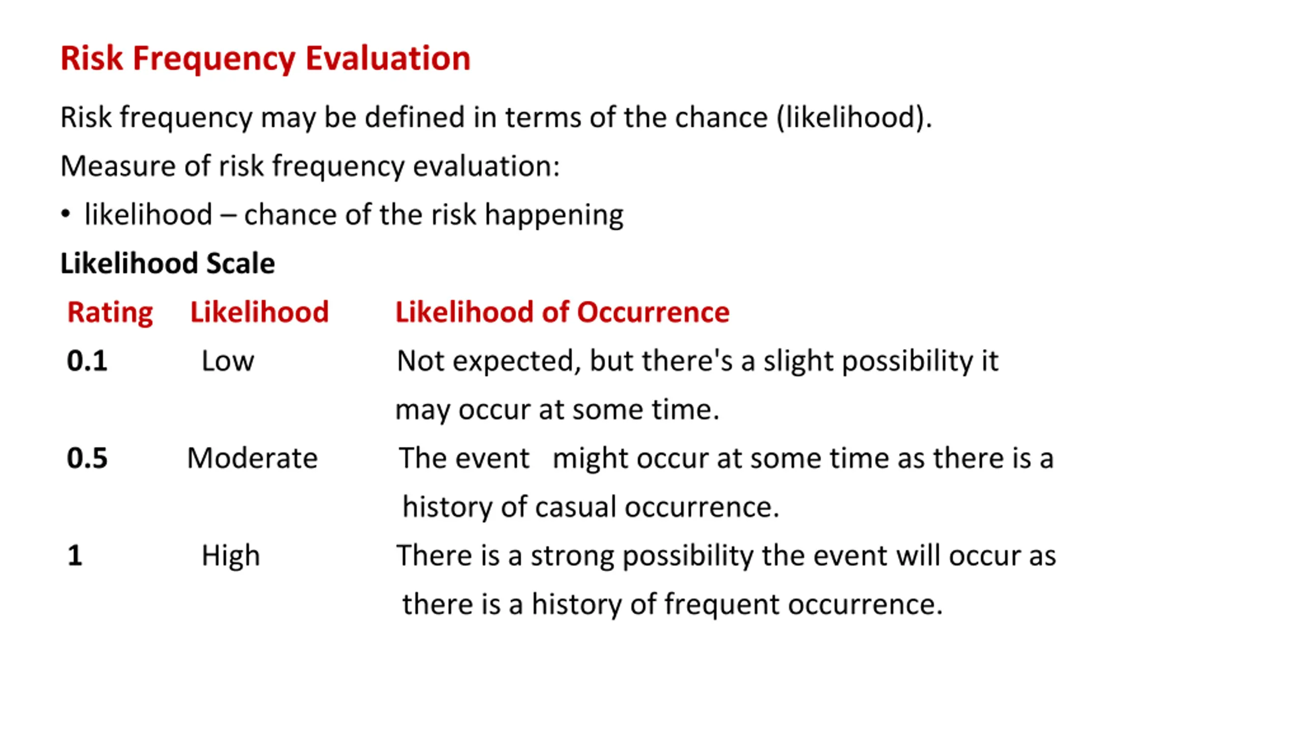 Risk Frequency Evaluation Risk frequency may be defined in terms of the chance (likelihood). Measure of risk frequency evaluation: likelihood chance of the risk happening Likelihood Scale Rating Likelihood Likelihood of Occurrence 0.1 Low Not expected, but there's a slight possibility it may occur at some time. 0.5 Moderate The event might occur at some time as there is a history of casual occurrence. 1 High There is a strong possibility the event will occur as there is a history of frequent occurrence.