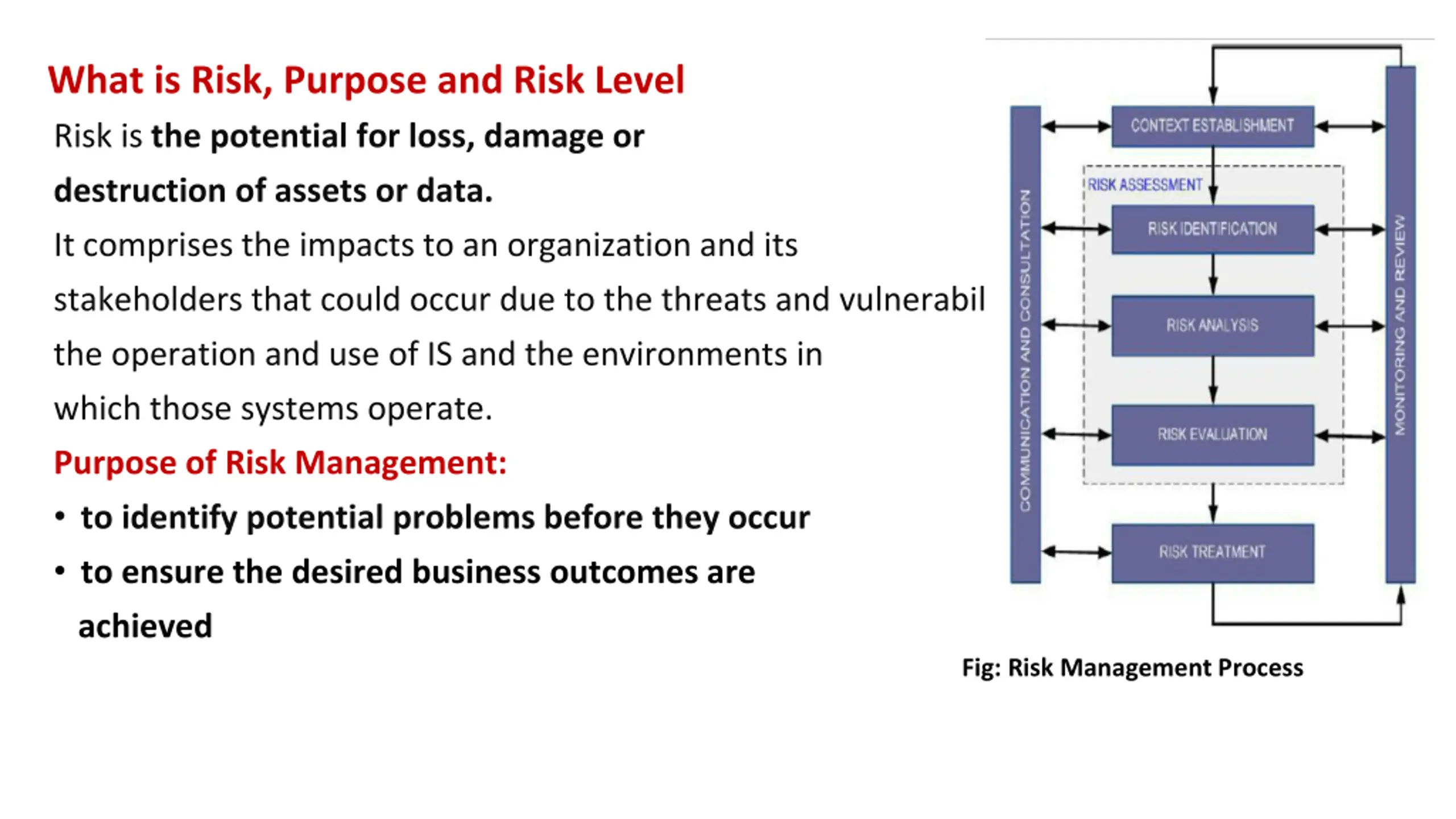 What is Risk, Purpose and Risk Level Risk is the potential for loss, damage or destruction of assets or data. It comprises the impacts to an organization and its stakeholders that could occur due to the threats and vulnerabilities associated with the operation and use of IS and the environments in which those systems operate. Purpose of Risk Management: to identify potential problems before they occur to ensure the desired business outcomes are achieved Fig: Risk Management Process