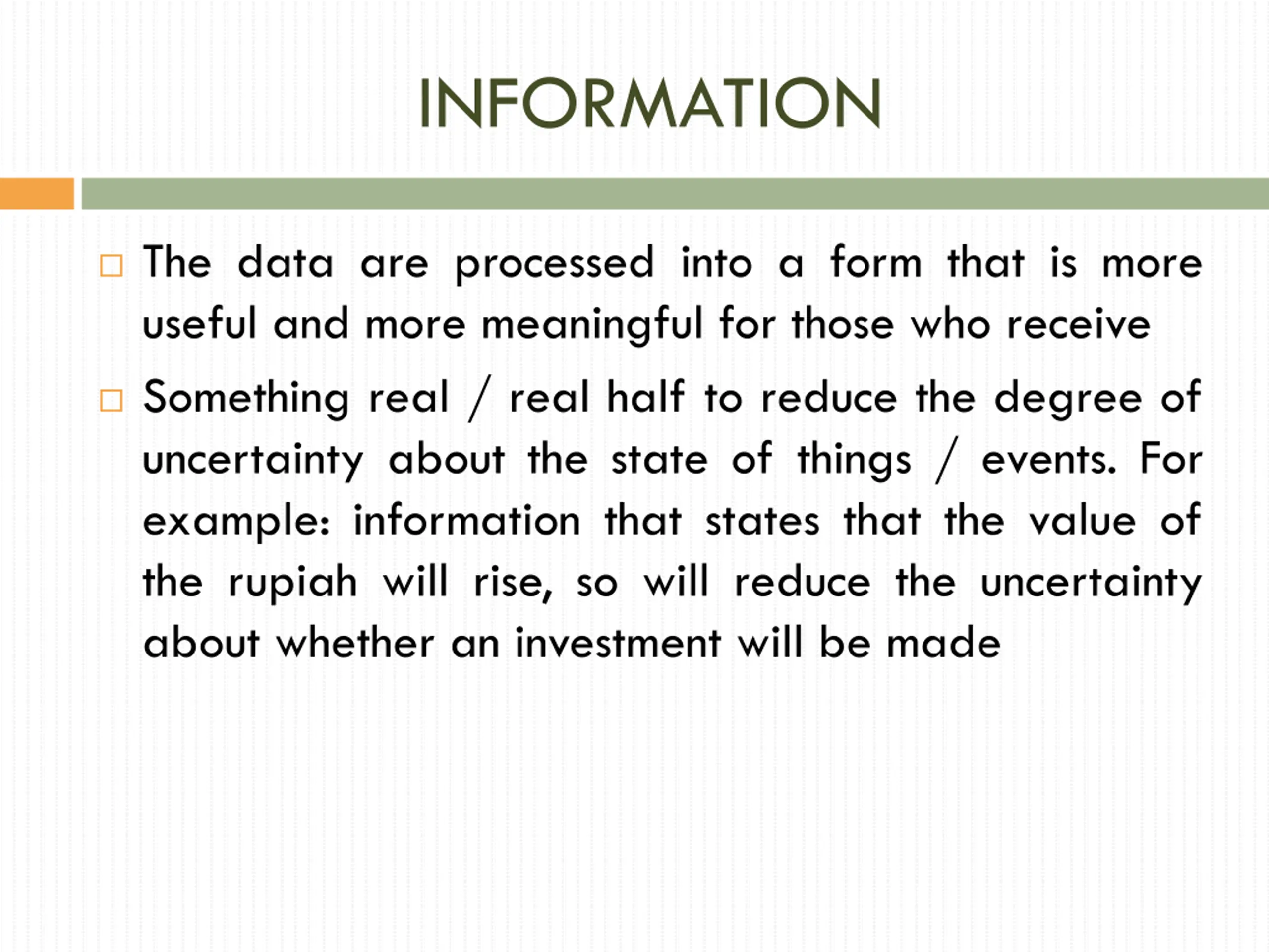 INFORMATION The data are processed into a form that is more useful and more meaningful for those who receive Something real / real half to reduce the degree of uncertainty about the state of things / events. For example: information that states that the value of the rupiah will rise, so will reduce the uncertainty about whether an investment will be made